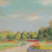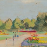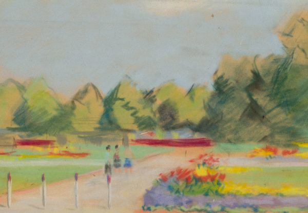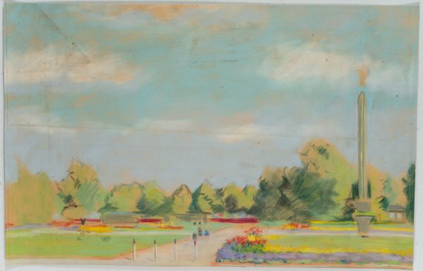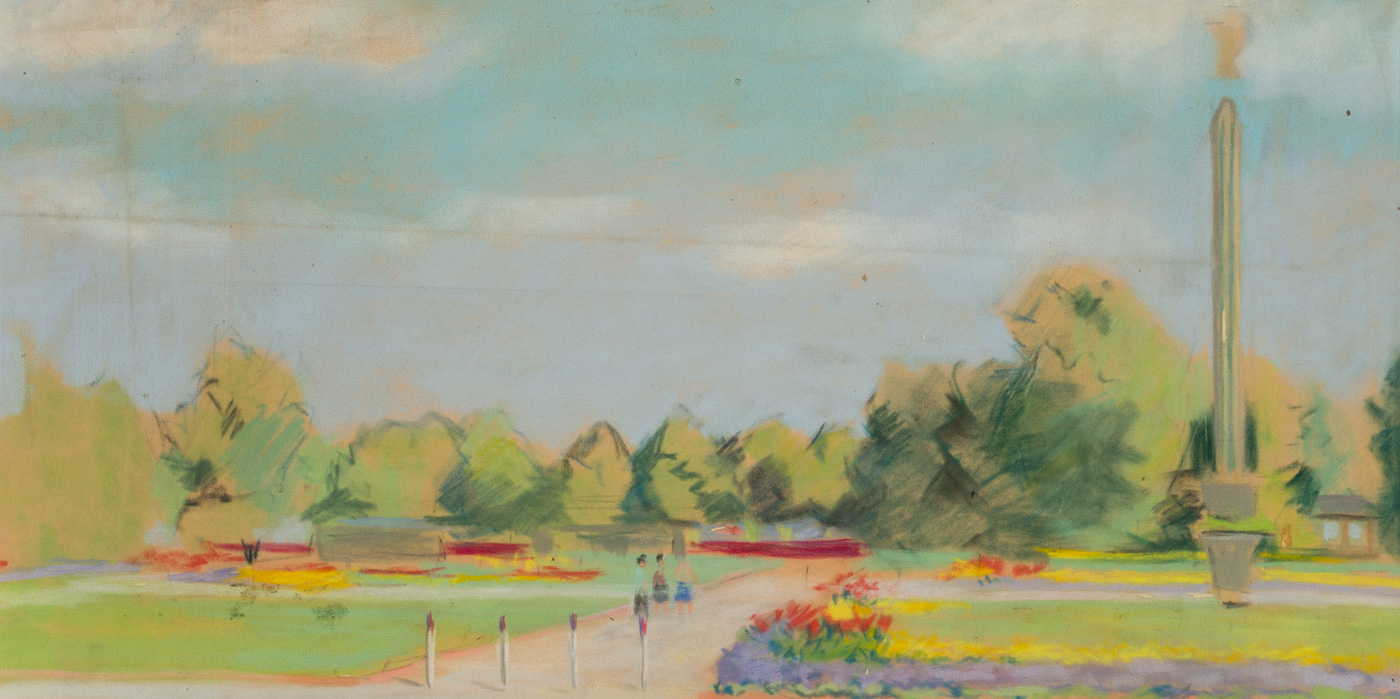 Unknown (20th century), View of a park with flowers and obelisk, , Pastel