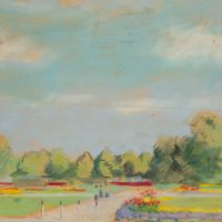 - Beschreibung: Blick in einen weiten Park, durch dessen Mitte sich ein Weg zieht. Dort sind vereinzelt Figuren zu erkennen. Gesäumt werden die Wege von bunten Blumenrabatten, eine Baumgruppe schließt den Ausblick zum Horizont hin ab.
