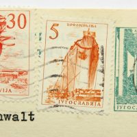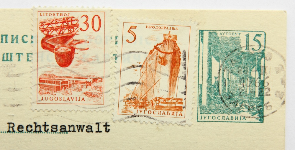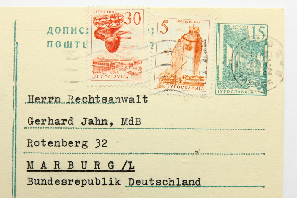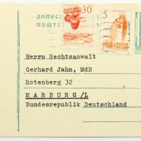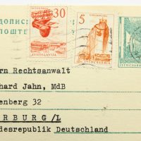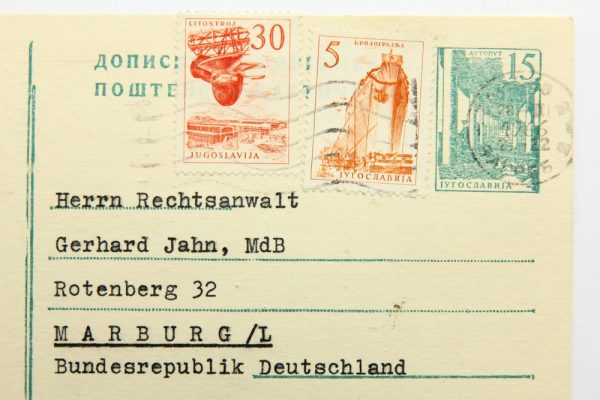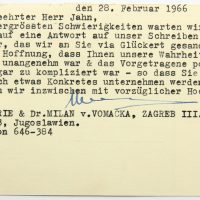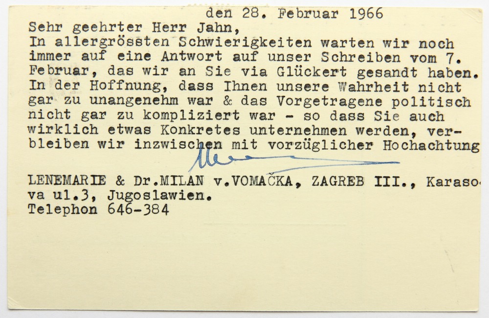 - Beschreibung: Schreiben in Form einer Postkarte adressiert an “Herrn Rechtsanwalt Gerhard Jahn, MdB – Rotenberg 32 – Marburg/L – Bundesrepublik Deutschland”. Frankiert mit zwei Briefmarken aus Jugoslavien sowie dem Abdruck einer dritten Marke. Gelaufen am 28. Februar 1966. Das kurze maschinengetippte Schreiben in deutscher Sprache ist mit blauer Tinte unterschrieben. Als Absender sind “Lenemarie & Dr. Milan v. Vomacka, Zagreb III., Karasova ul.3, Jugoslawien” bezeichnet.