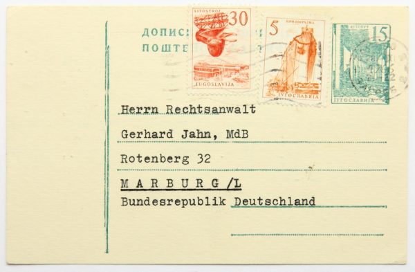 - Description: Letter in the form of a postcard addressed to “Mr. Gerhard Jahn, MdB – Rotenberg 32 – Marburg/L – Federal Republic of Germany”. Franked with two stamps from Yugoslavia and the imprint of a third stamp. Mailed on 28 February 1966. The short typed letter in German is signed in blue ink. The sender is “Lenemarie & Dr. Milan v. Vomacka, Zagreb III, Karasova ul.3, Yugoslavia”.