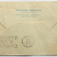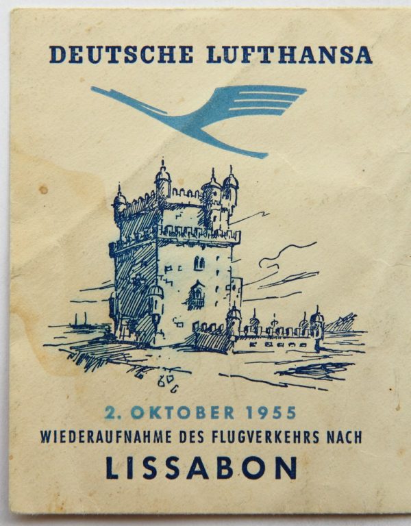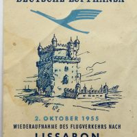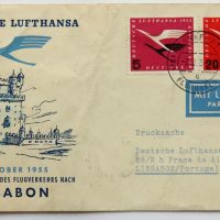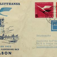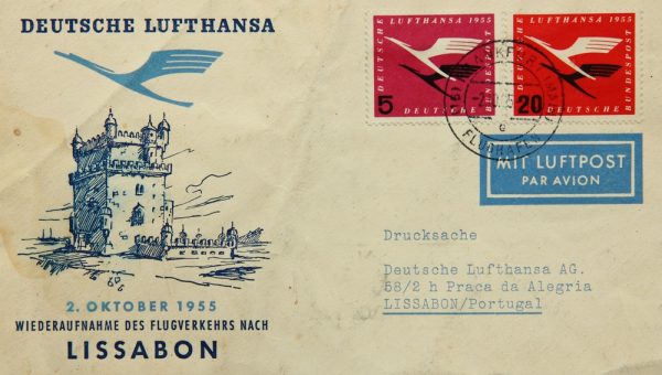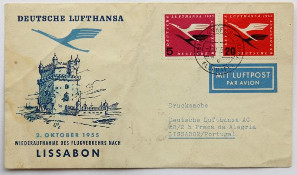 - Description: German Lufthansa envelope printed in colour on the occasion of the resumption of air traffic to Lisbon on 02 October 1955. With stamps of 5 and 20 Pfennigs of the German Federal Post Office with Lufthansa logo. Mailed on 02 October 1955.