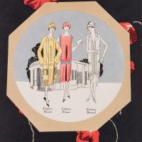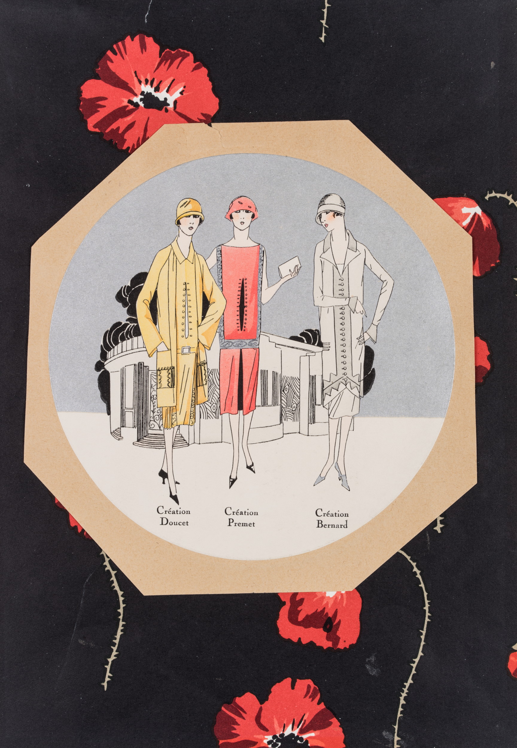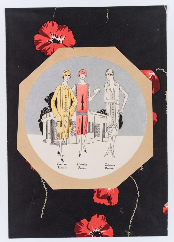 - Beschreibung: Darstellung dreier Mannequins in geradliniger, moderner Mode der 20er Jahre mit Hut. Im Hintergrund eine Art Deco Architektur. Aufgelegt auf ein Papier mit farbenprächtig gedrucktem Mohnblumenmuster.