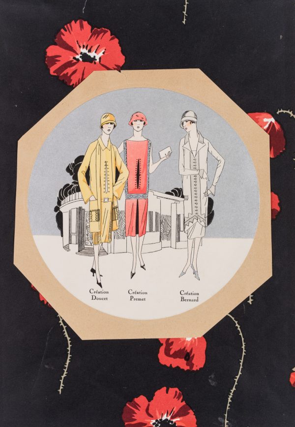 - Description: Depiction of three mannequins in straight, modern fashion of the 1920s with hat. In the background an Art Deco architecture. Laid down on a paper with a colourfully printed poppy pattern.