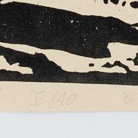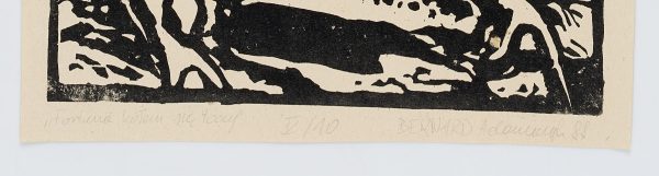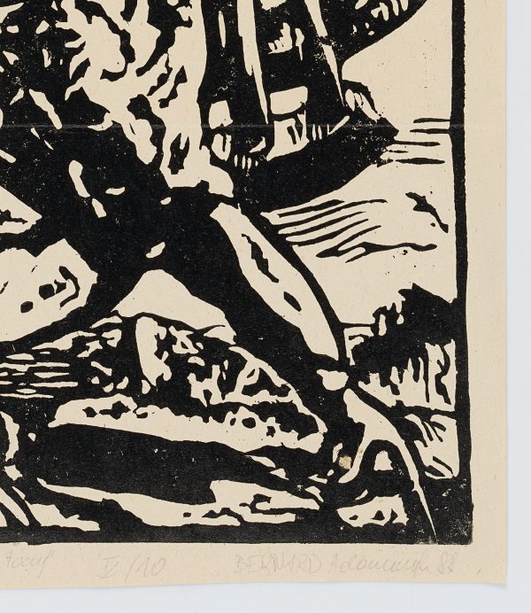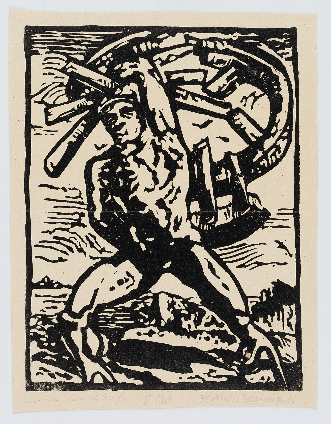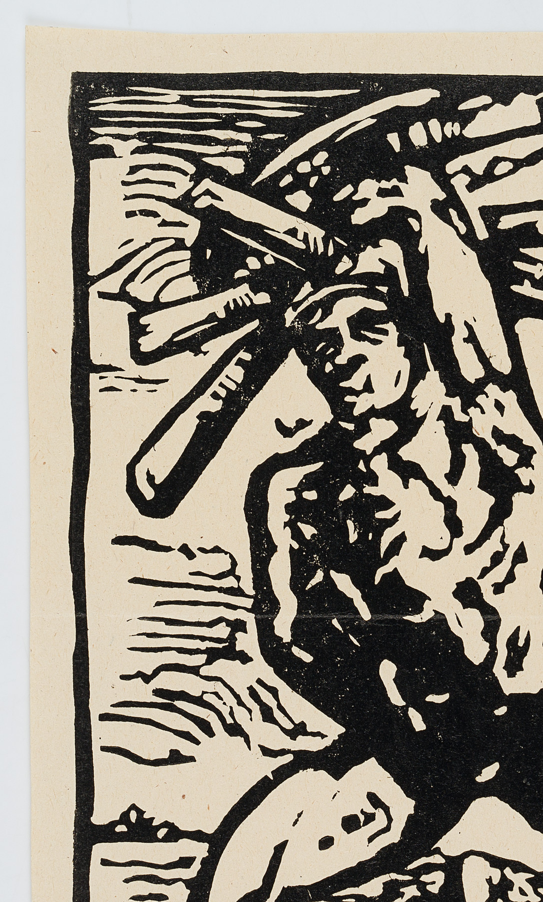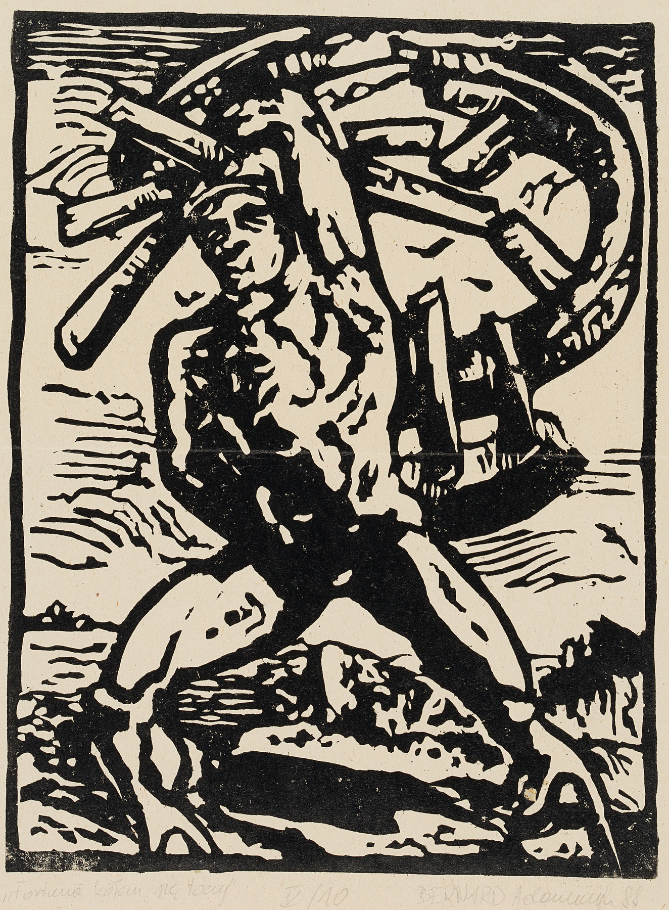 Unbekannt (20. Jahrhundert), Das zerbrochene Rad der Fortuna, 1988, Linolschnitt