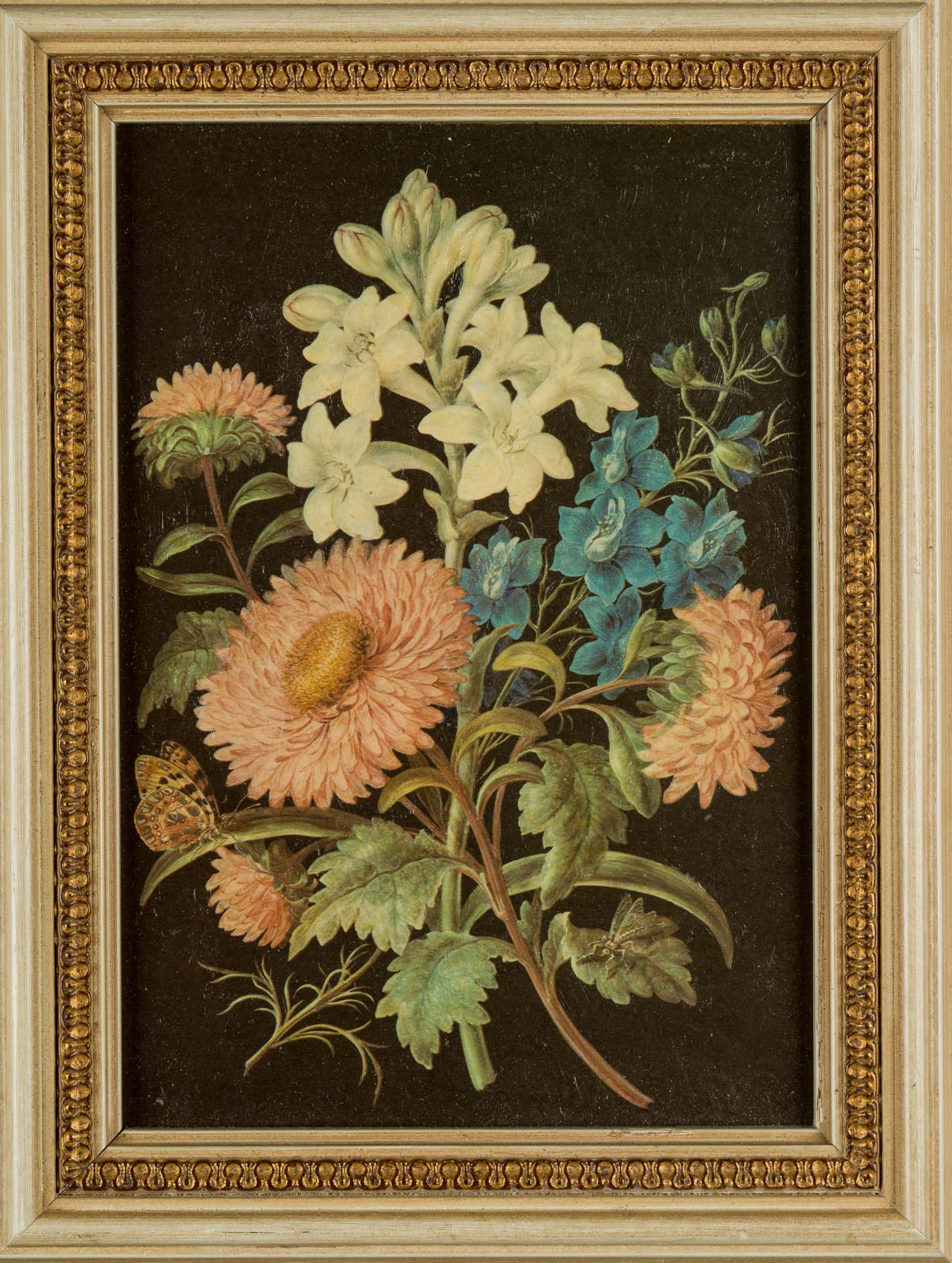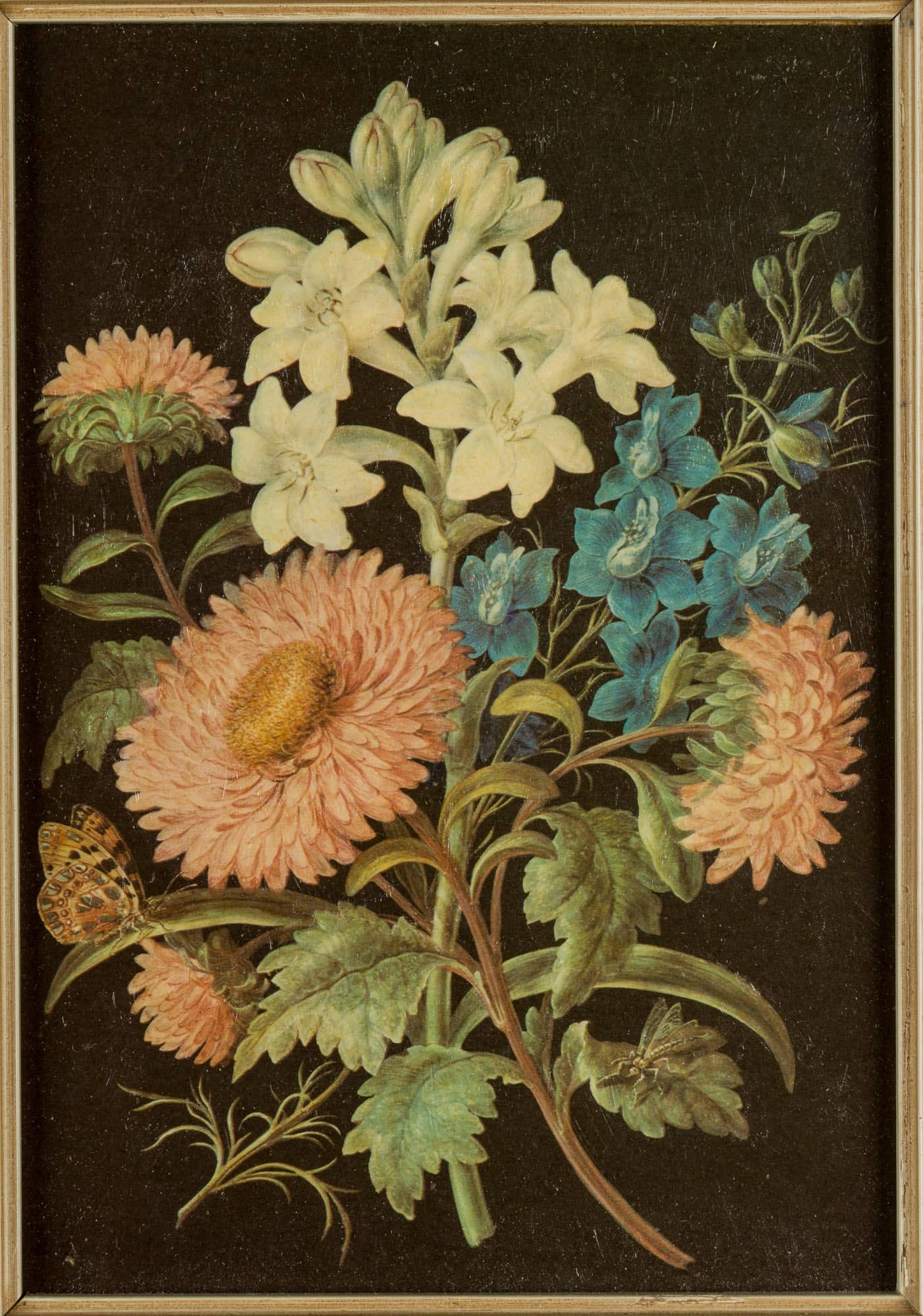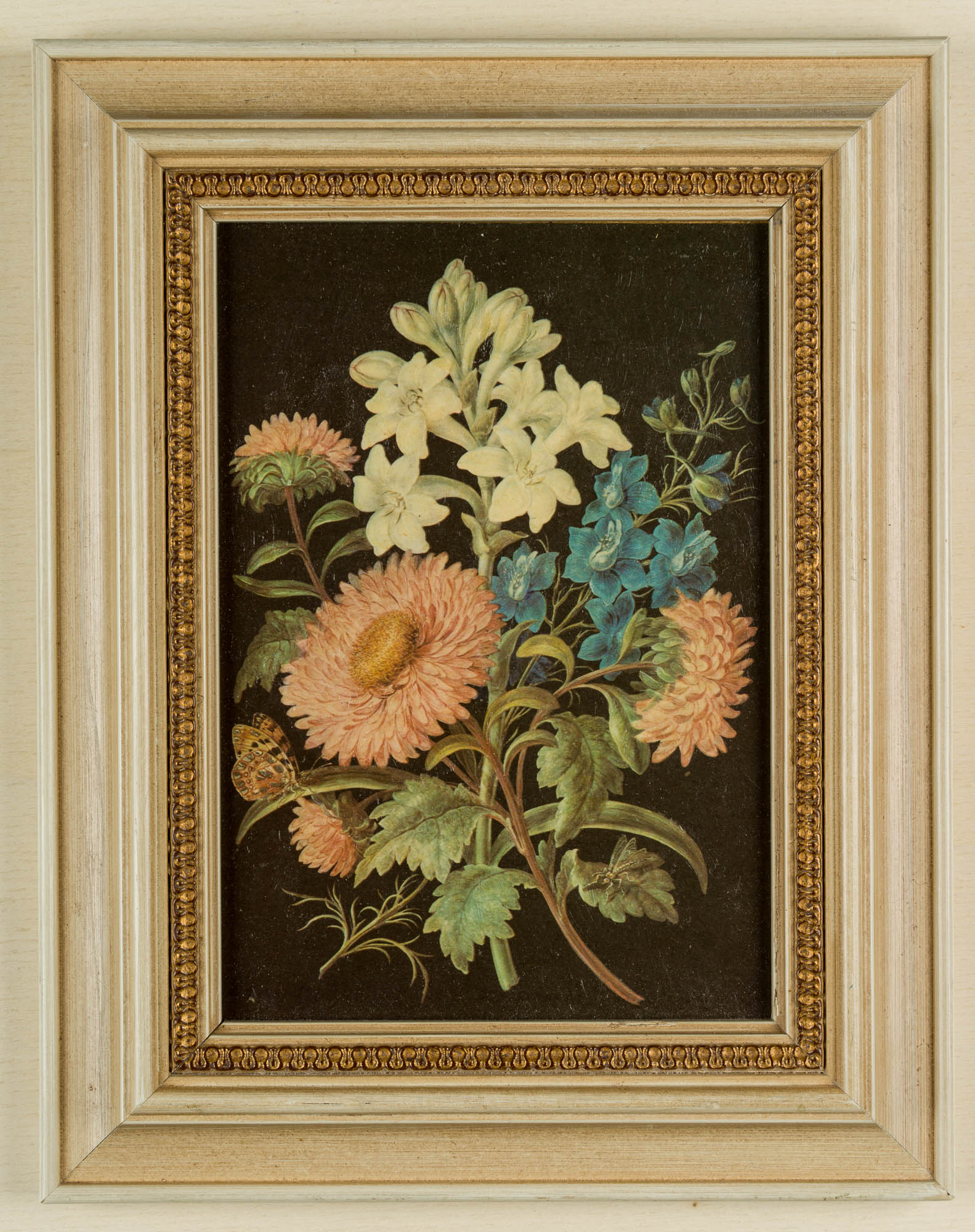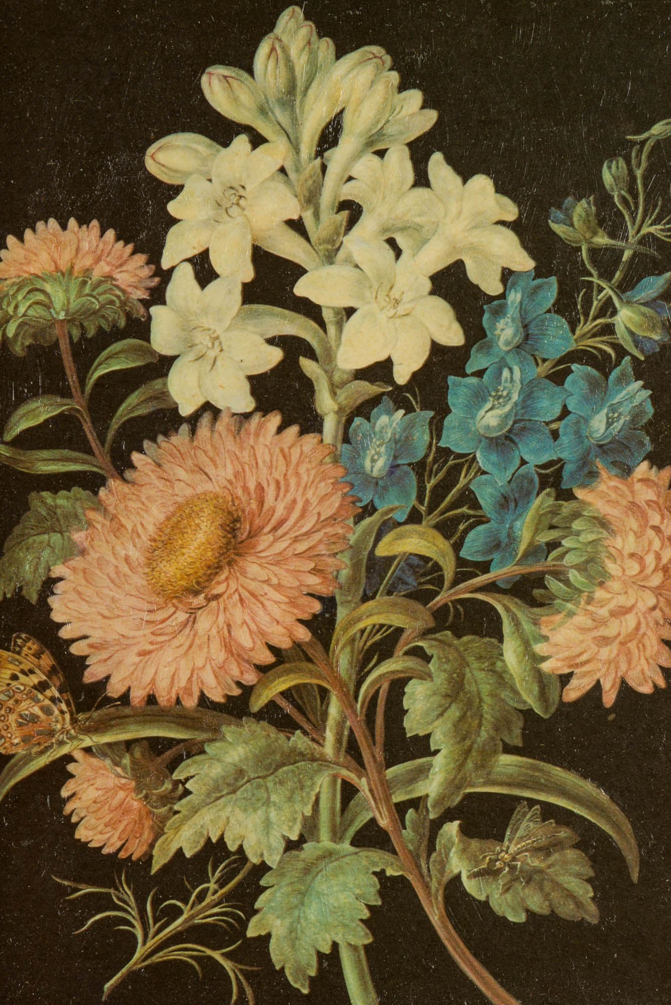• Description: Still life arrangements of delphinium, asters and tuberose with moth. An imitated brush structure is visible on the surface.