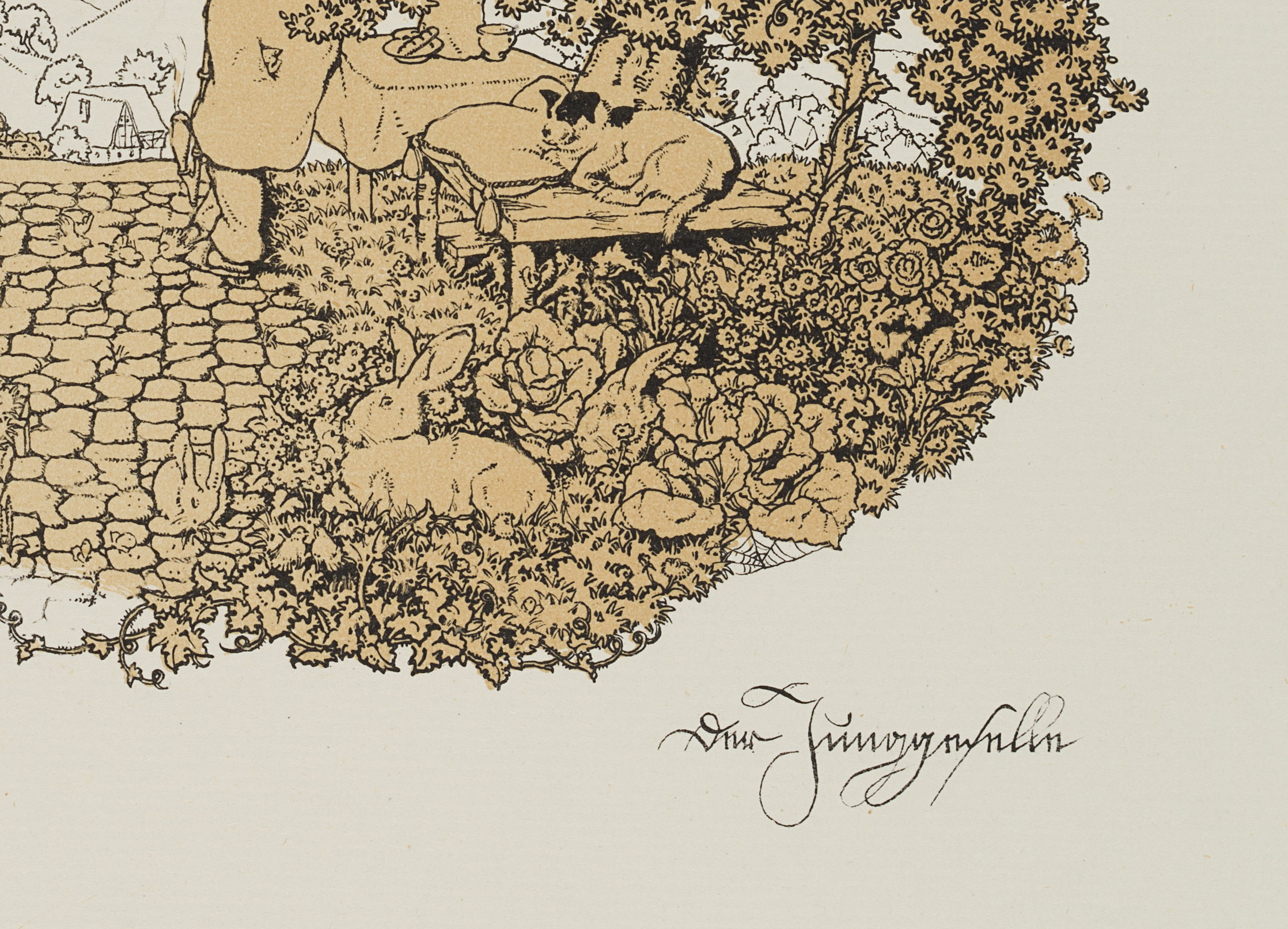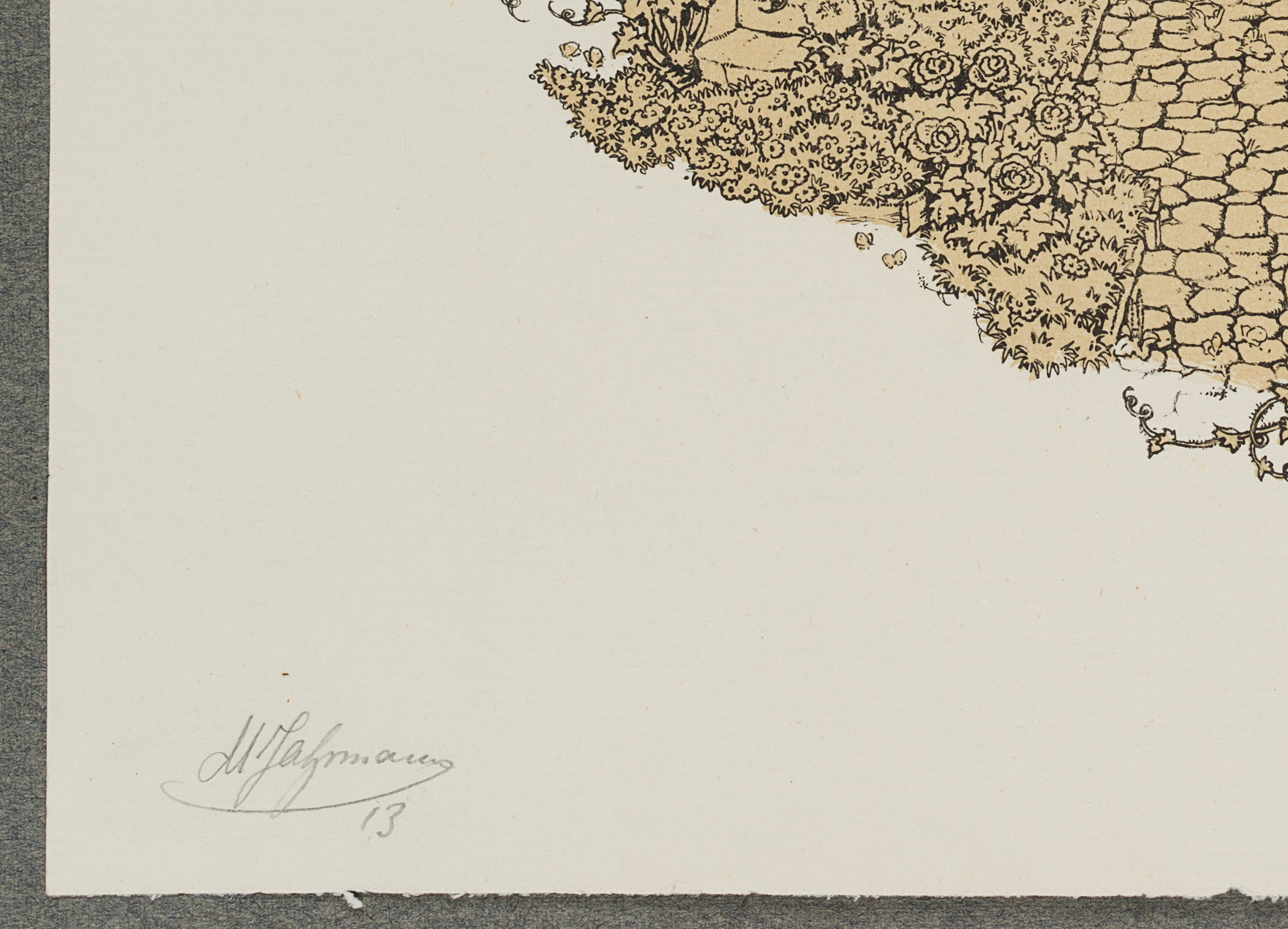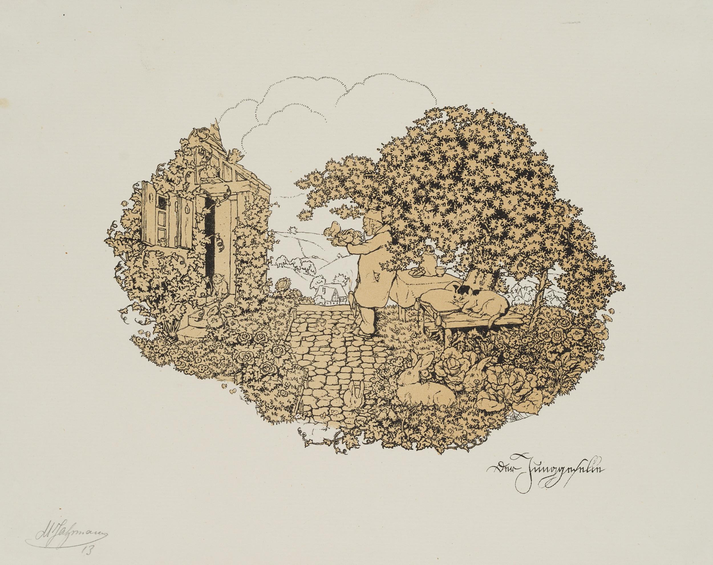 - Inscription: lower left signed: “M. Jahmann [?]”. Lower right inscribed in the printing plate: “der Junggeselle”. lower left dated: “13”.