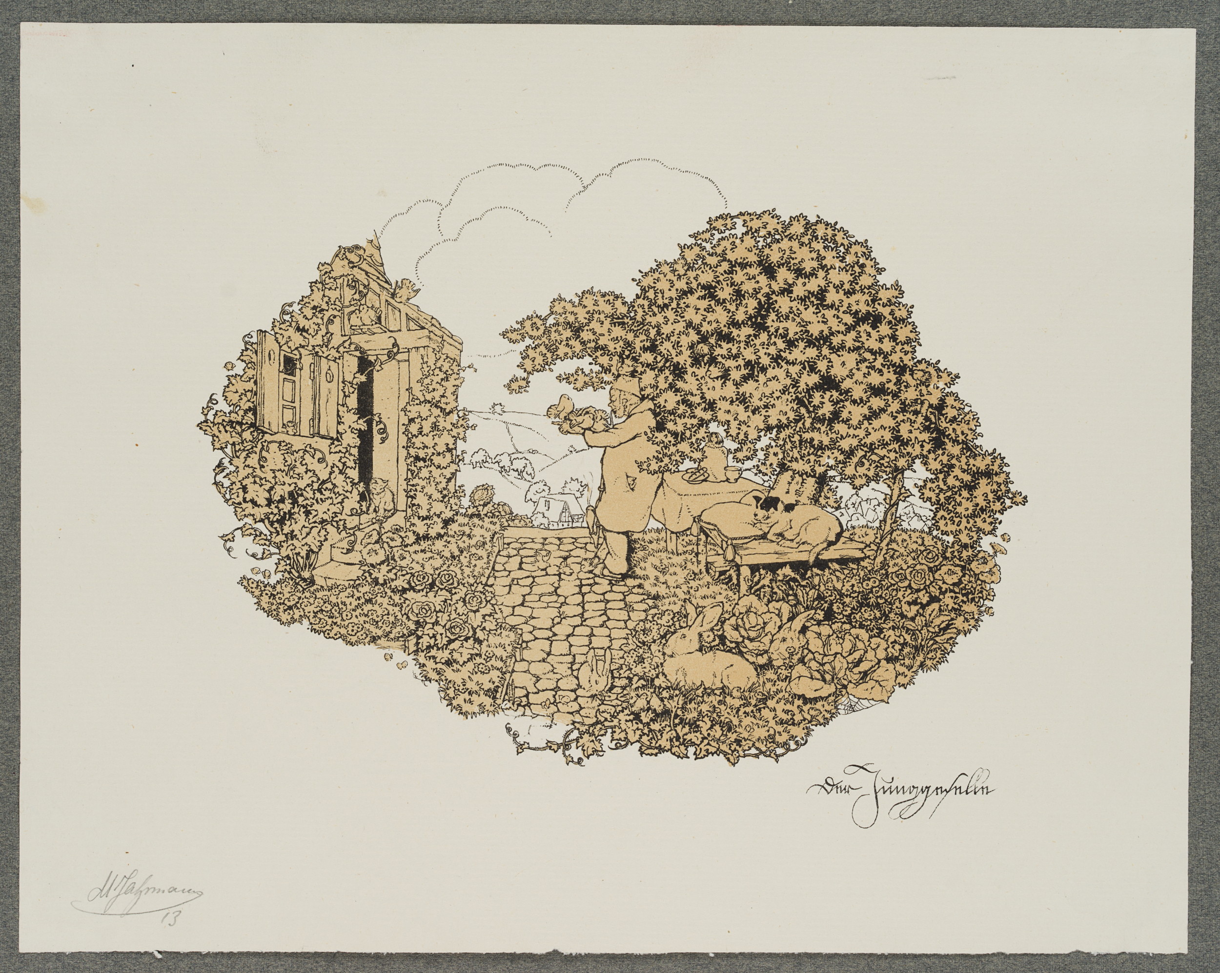 - Bezeichnung: Unten links signiert: “M. Jahmann [?]”. Unten links datiert: “13”. Unten rechts im Druck bezeichnet: “der Junggeselle”.