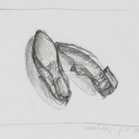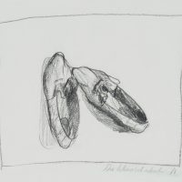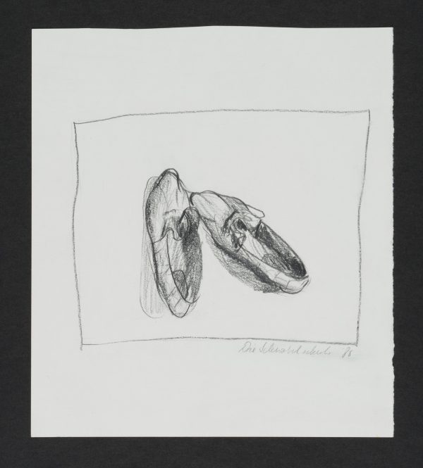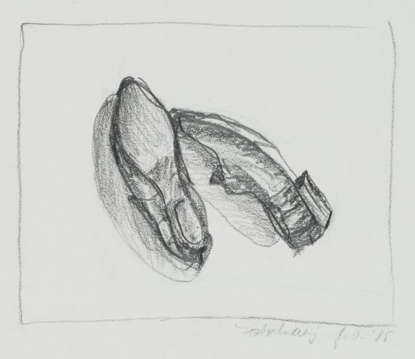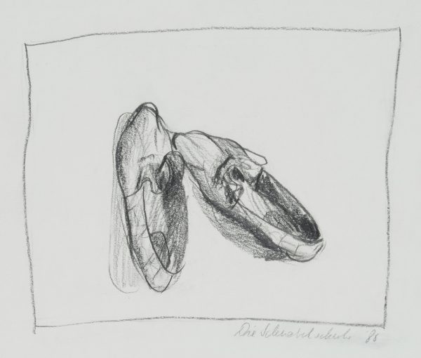 Unbekannt (20. Jahrhundert), Die Schnabelschuhe, Zwei Darstellungen, Ansicht von oben und der Sohlseite, 1986, Kohle
