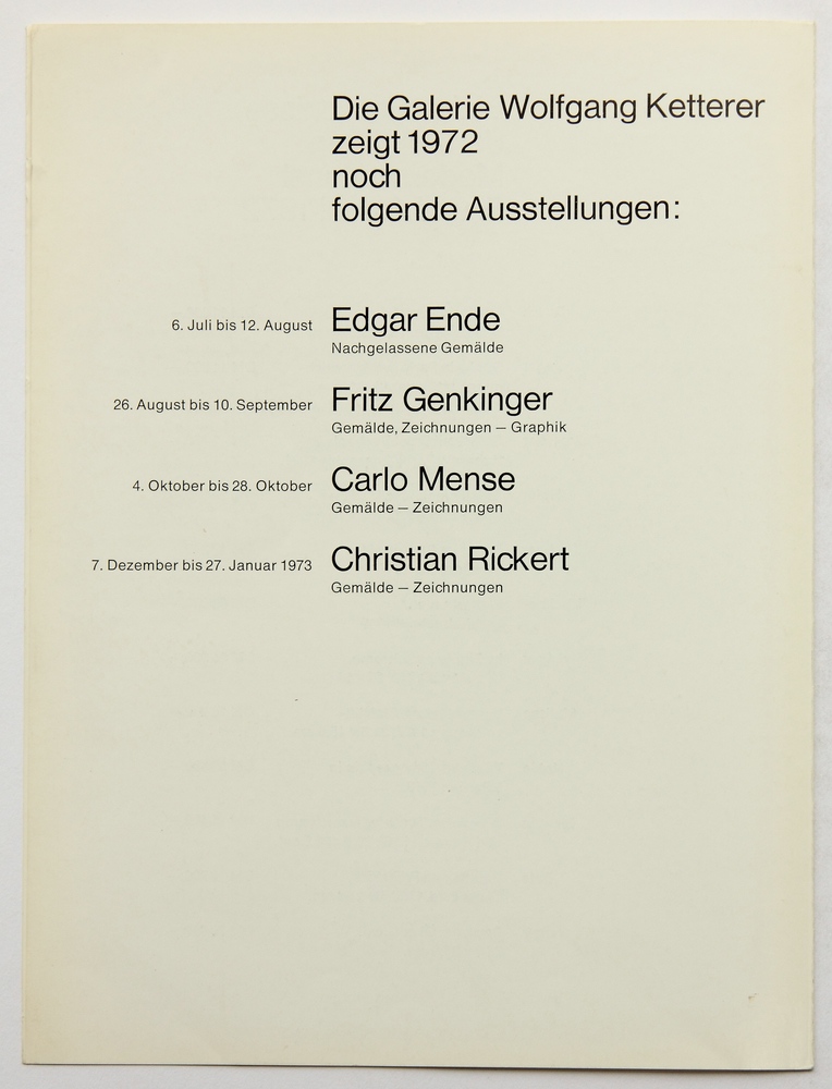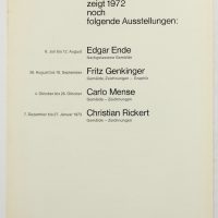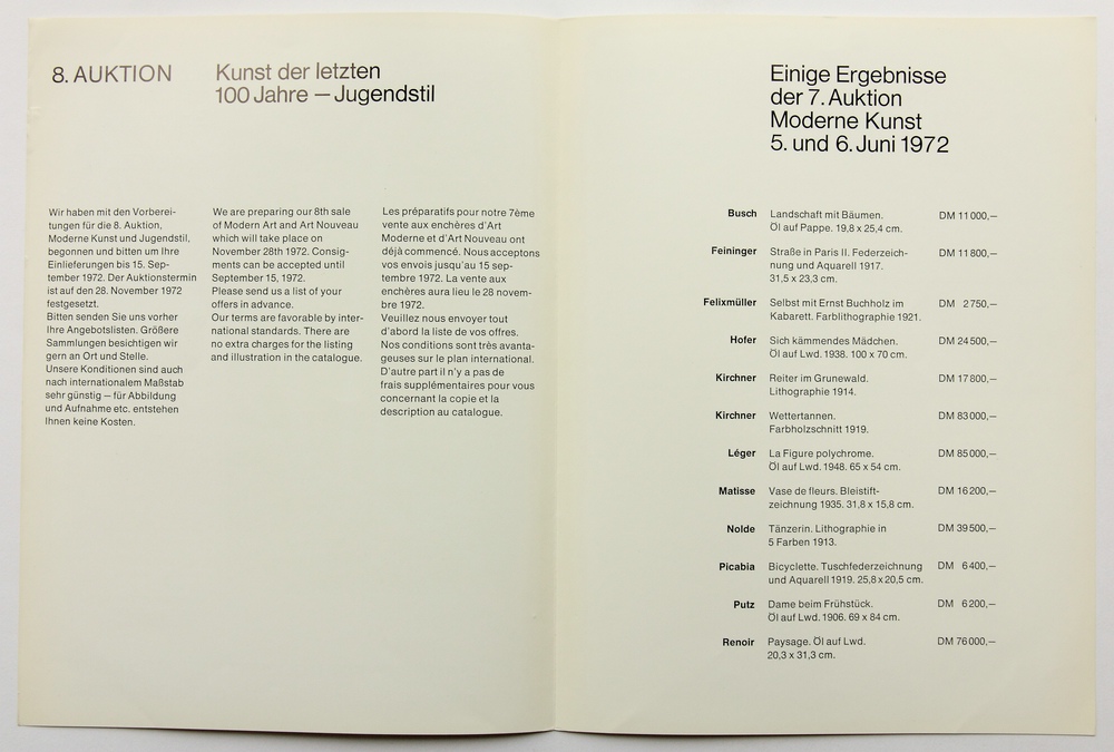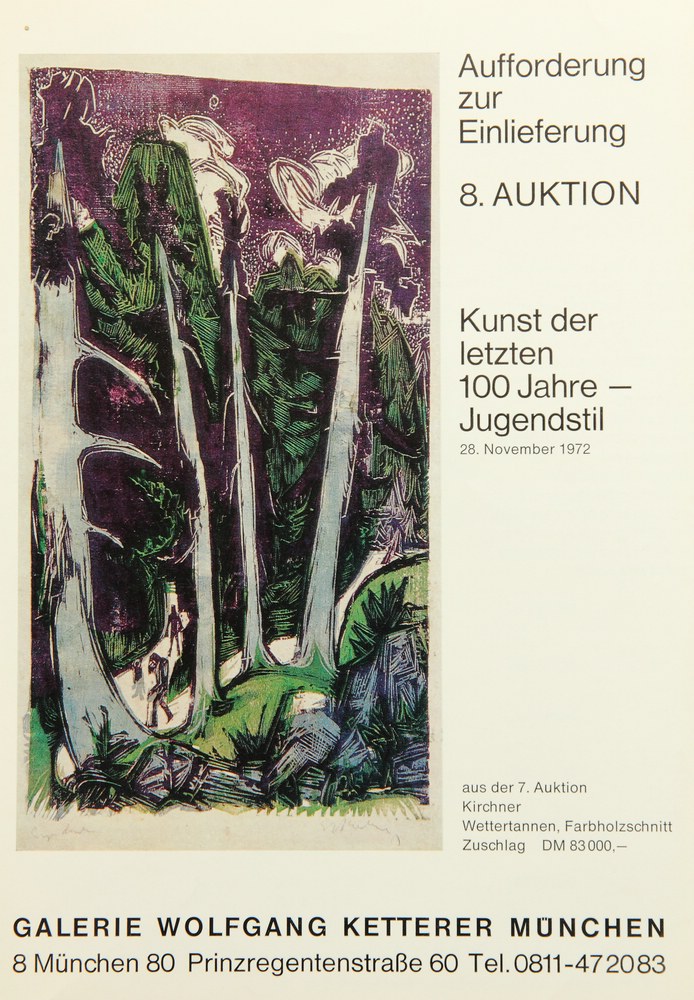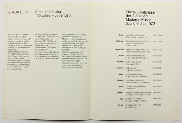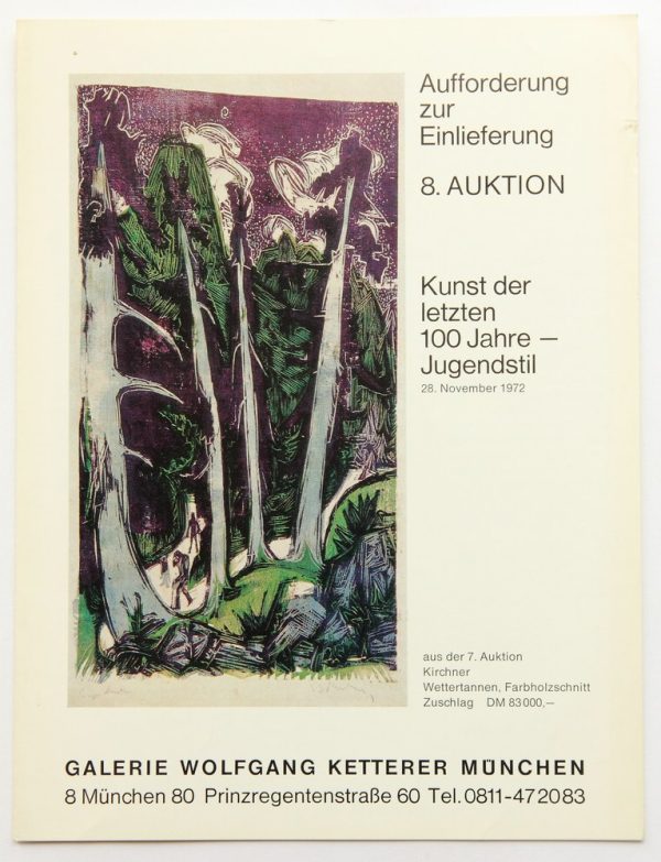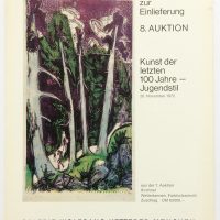 - Description: Coloured serigraphs on double-sided sheetlet of strong glossy paper. Information sheet on the announced auction as well as results of the last auction of the house with prices. The title page shows a work of art from the previous auction: “Kichner Wettertannen”.
