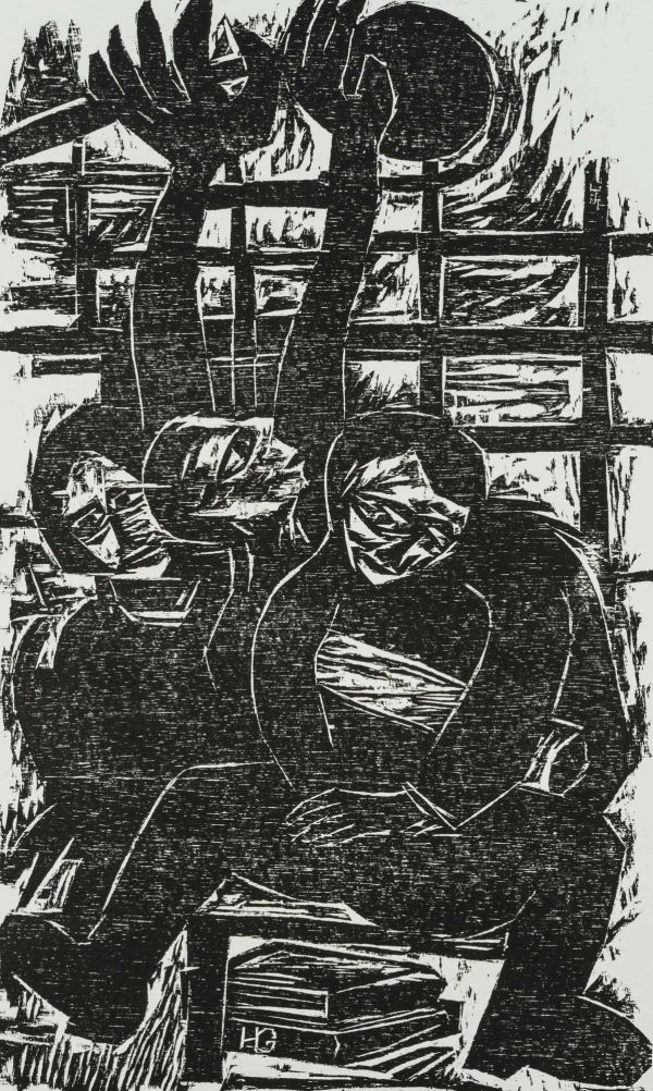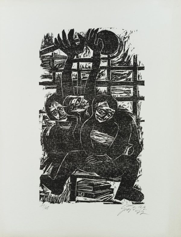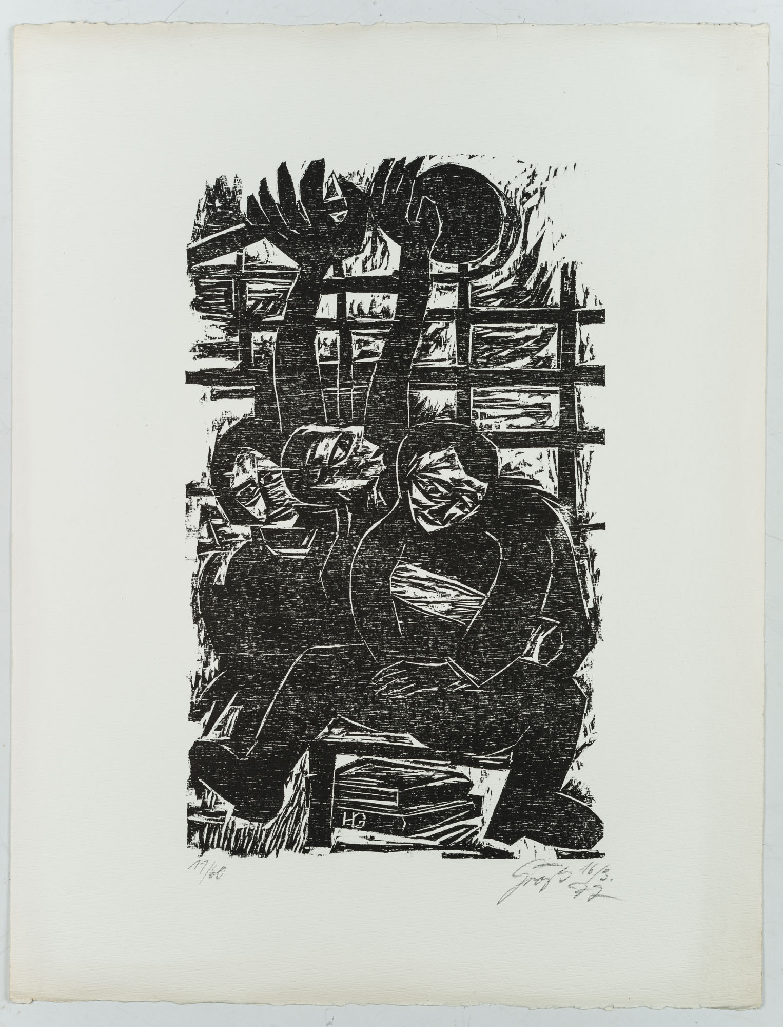 Unknown (20th century), Expressionist depiction of hard working figures, 1972, Woodcut