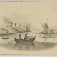 Unknown (20th century), Fishing boat in front of a city skyline, c. 1900, Pencil