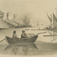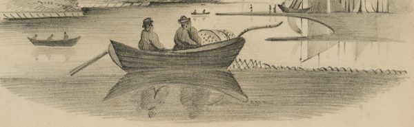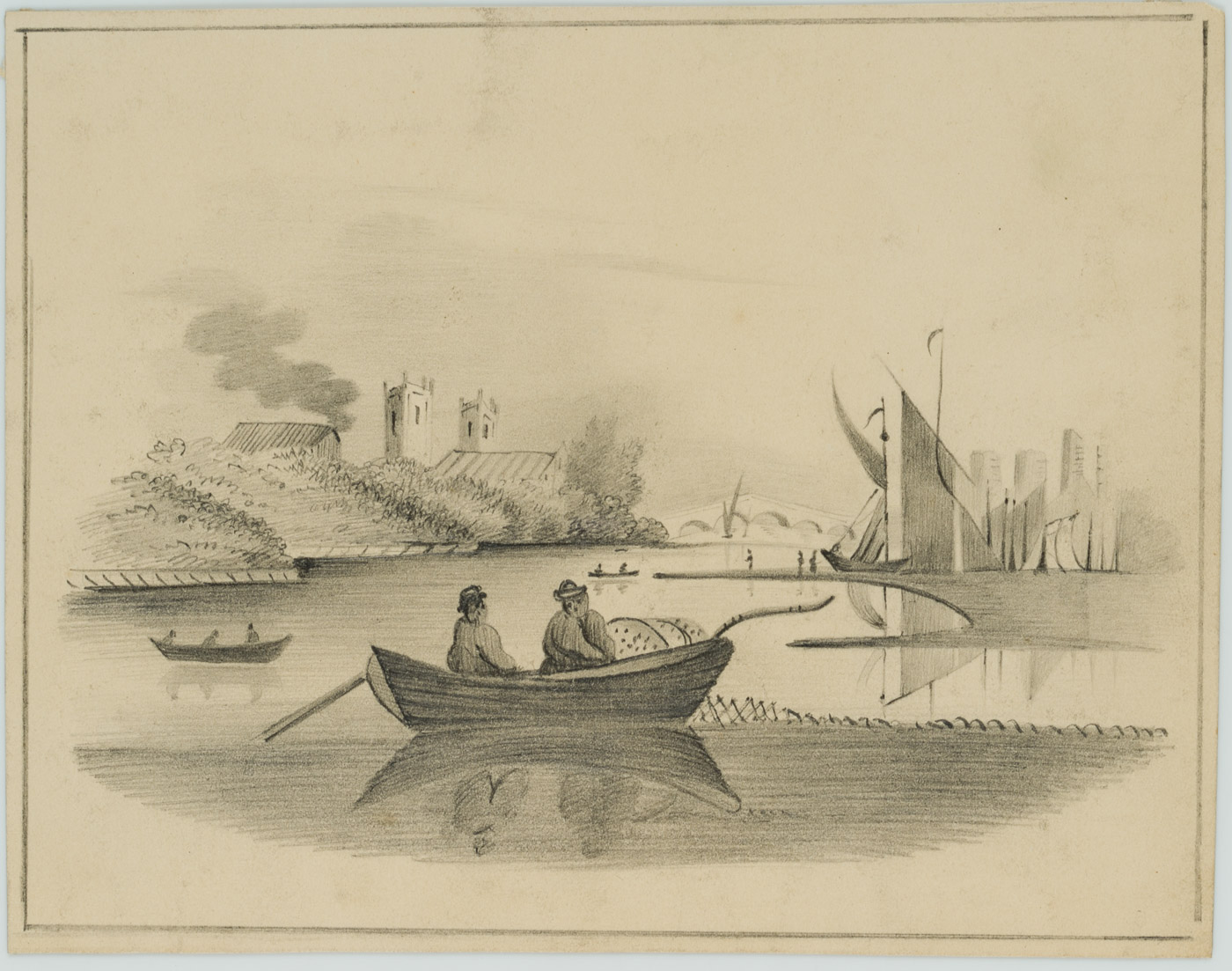 - Beschreibung: Im Vordergrund der Darstellung, auf einem ruhigen Gewässer treibend, ist ein Fischerboot mit zwei Fischern zu erkennen. Ihr Netz ausgeworfen, scheinen die beiden Figuren auf den Fang zu warten. Im Hintergrund weitere Boote und das Ufer mit der Silhouette einer Kirche und eines Gebäudes, aus dessen Dachfirst Rauch aufsteigt.