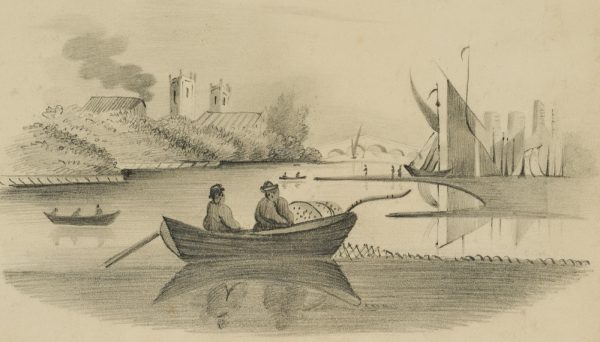 Unbekannt (20. Jahrhundert), Fischerboot vor einer Stadtsilhouette, um 1900, Bleistift