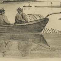 - Description: In the foreground of the depiction, floating on a calm body of water, is a fishing boat with two fishermen. Throwing out their nets, the two figures seem to be waiting for the catch. In the background are more boats and the shore with the silhouette of a church and a building with smoke rising from its roof ridge.