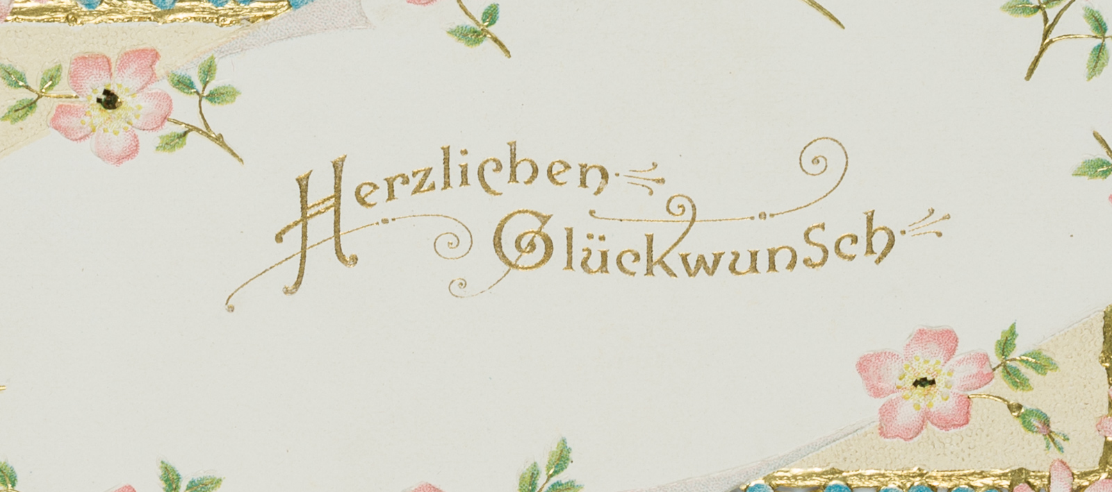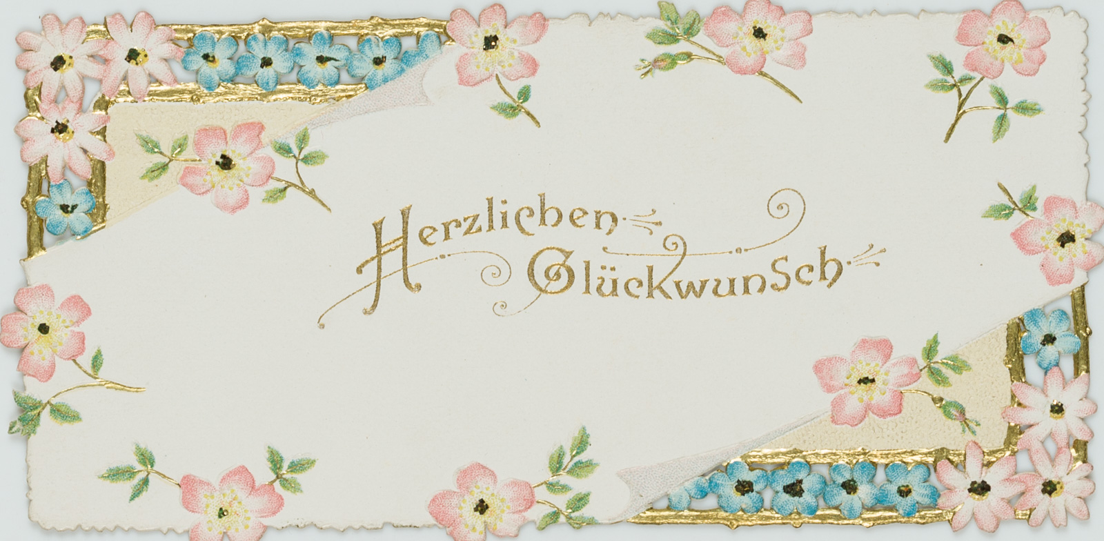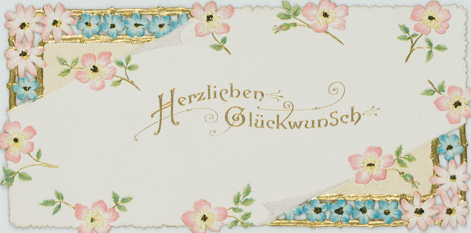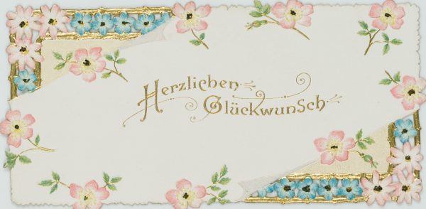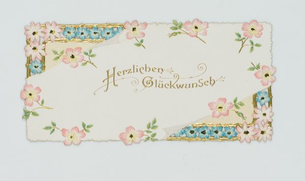- Beschreibung: Wunderschöne, filigran durchbrochene Glückwunschkarte mit Vergissmeinnicht und Goldrelief.