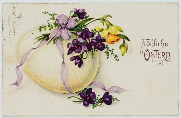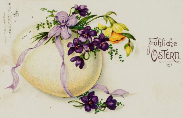 Unbekannt (20. Jahrhundert), “Fröhliche Ostern” Festtagskarte mit von Blumen geschmücktes Ei, um 1900, Glückwunschbillet