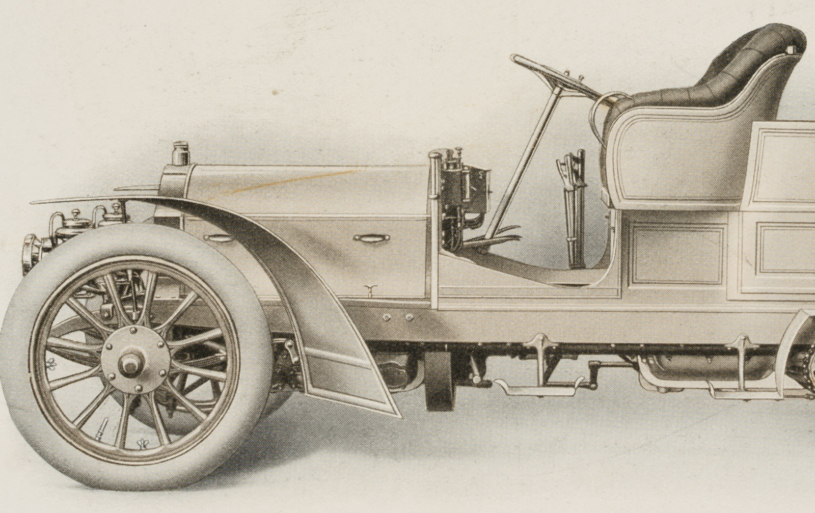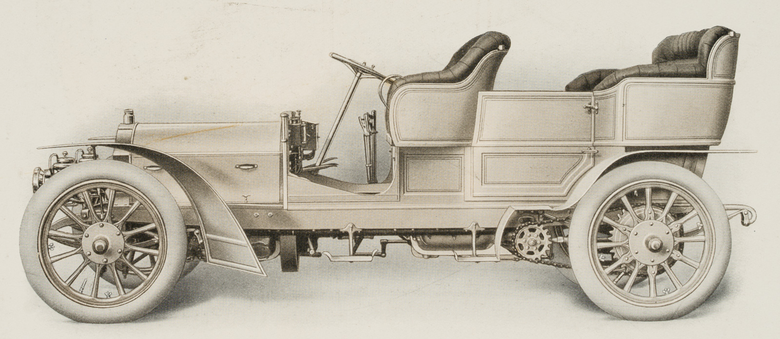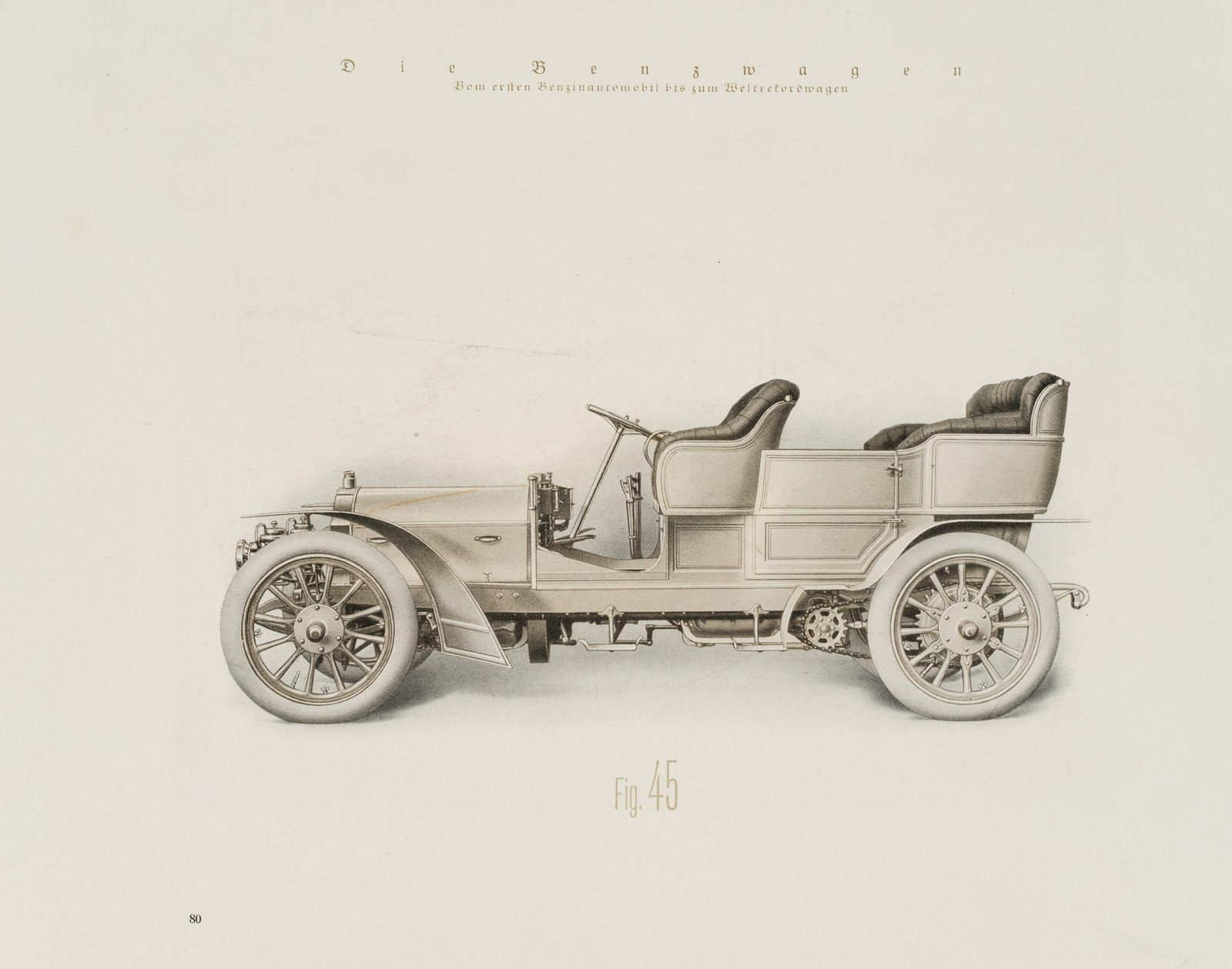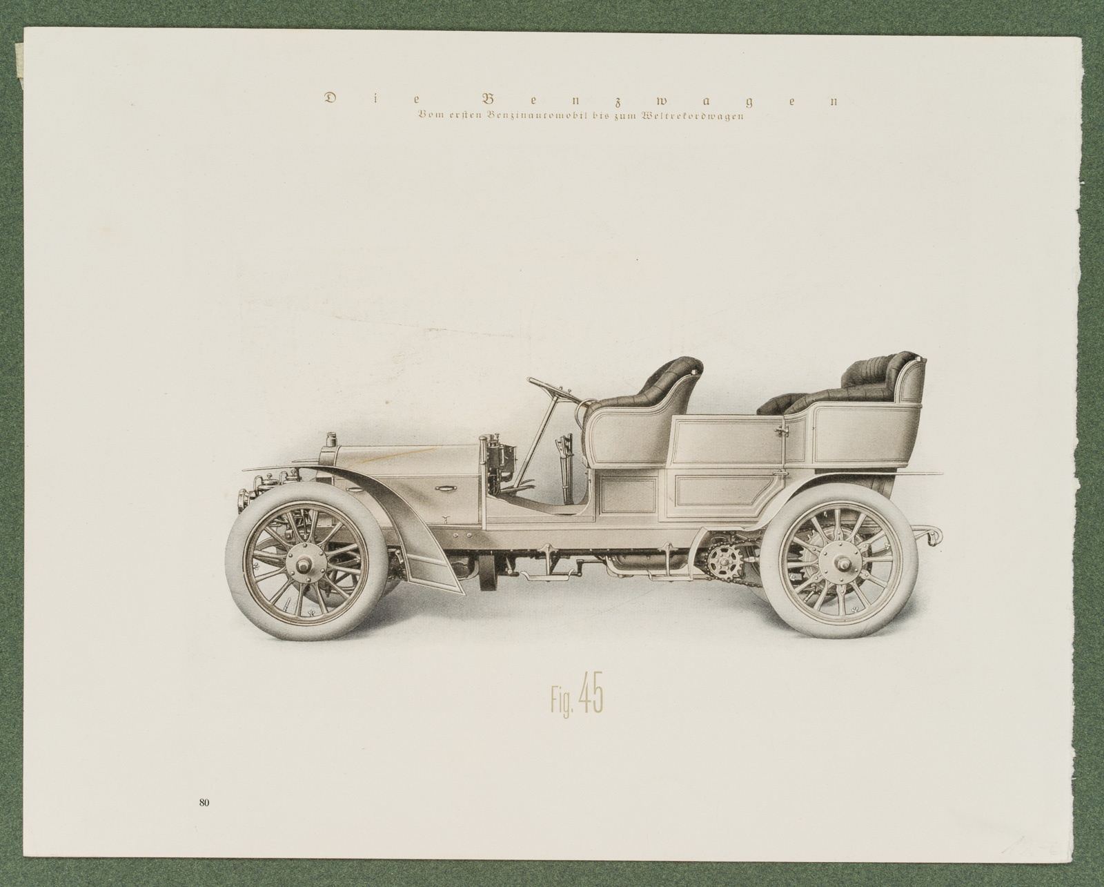- Inscription: Inscribed at the top “Die Benzwagen | Vom ersten Benzinautomobil bis zum Weltrekordwagen”. The convertible bears the number: “Fig. 45” and the sheet the page number “80”. The reverse side presents a closed petrol car mobile in black with the number “Fig. 44”.