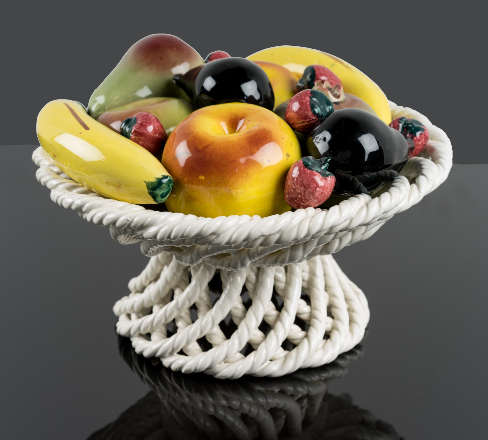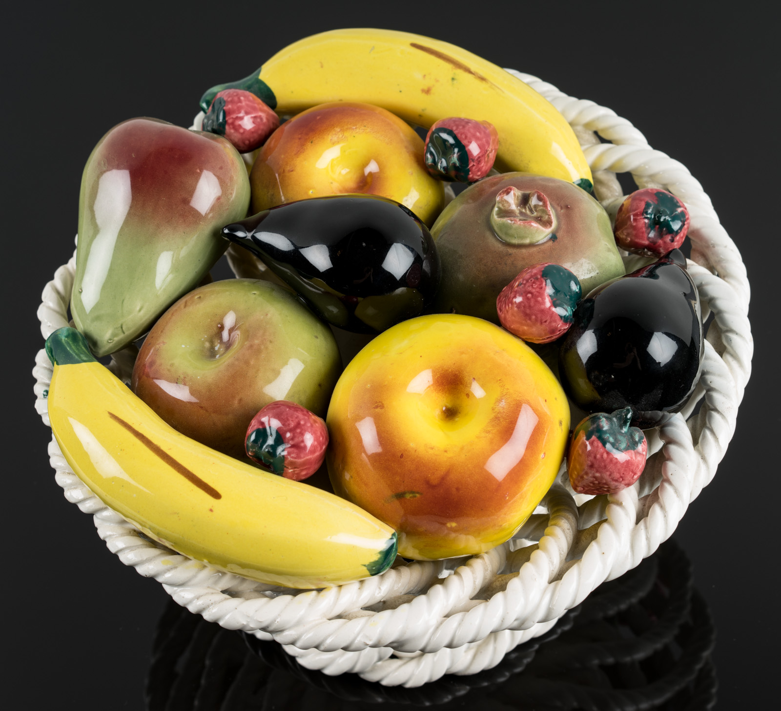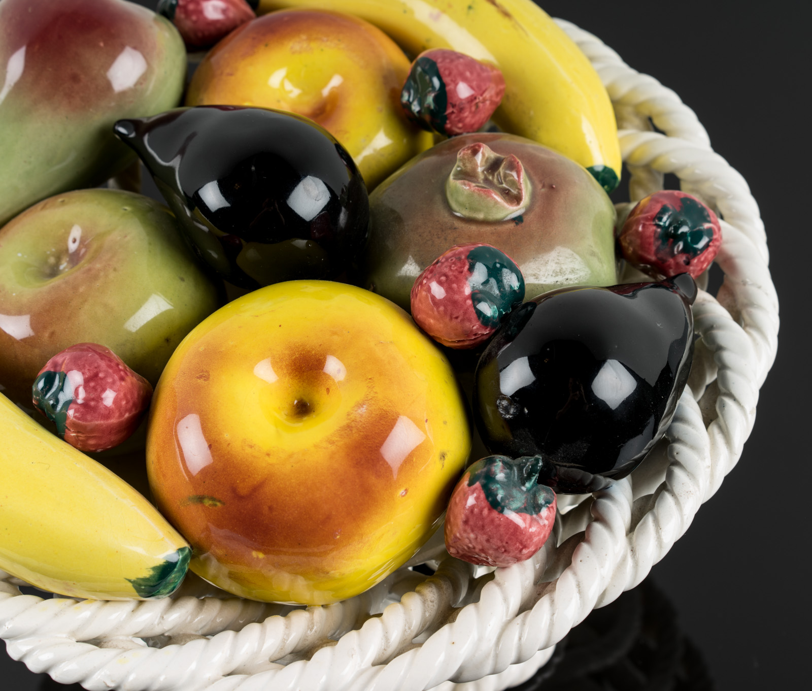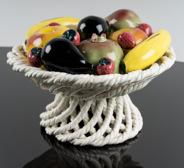 - Description: Elaborate Italian ornamental pottery or centrepiece with colourful glaze over white body. Naturalistic and very well observed depiction of fig, banana, apple, pear, pomegranate and strawberry.