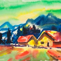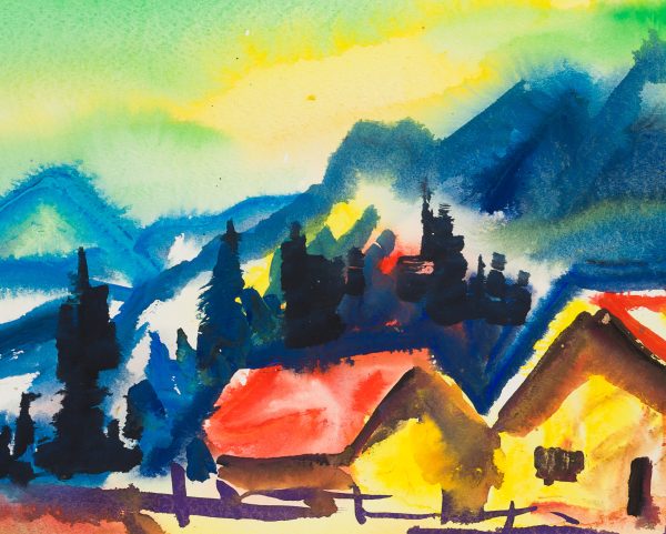 - Beschreibung: In leuchtenden, lasierenden Farben gemalte Landschaft am Fuß eines Gebirges. Im Vordergrund heben sich in starken Symbolfarben die Gebäude eines Gehöftes ab.