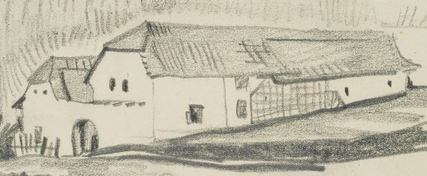 Unbekannt (20. Jahrhundert), Großes Gehöft in der Landschaft, 1938, Bleistift