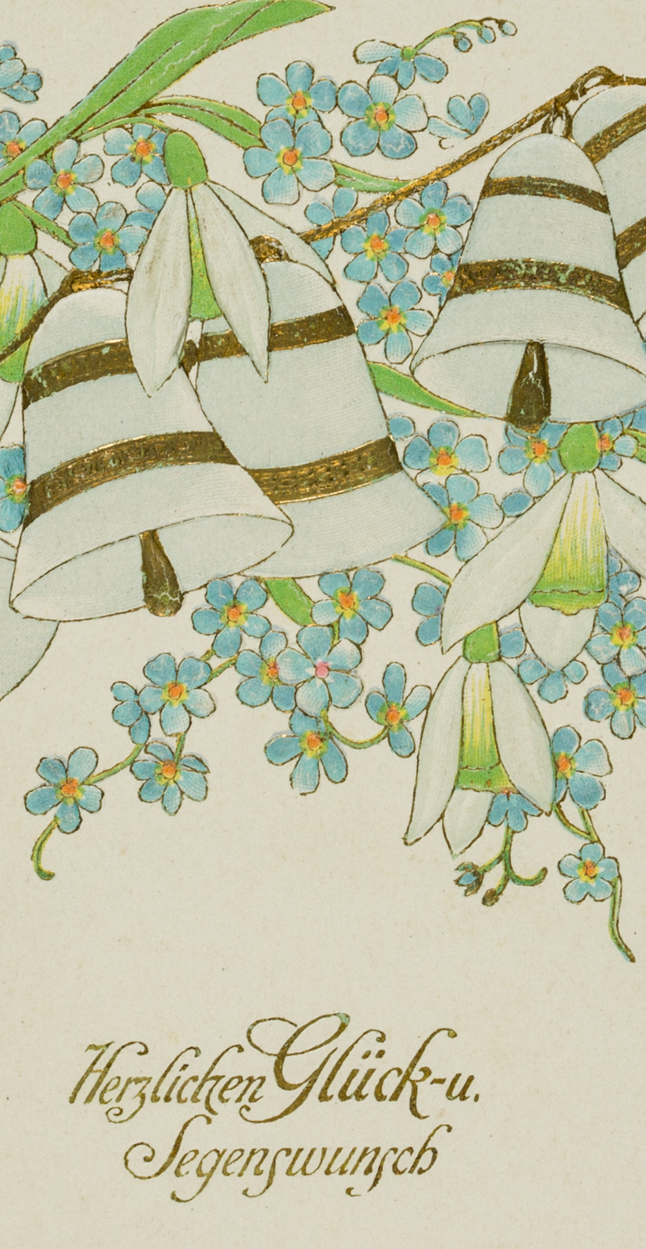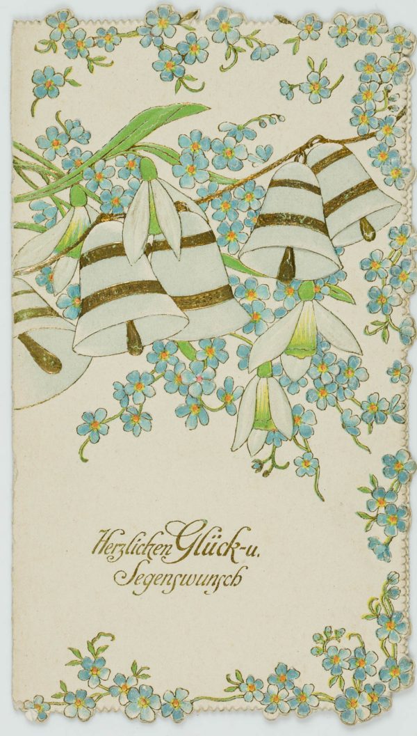 - Beschreibung: Wunderschöne Glückwunschkarte mit gestanzten Vergissmeinnicht und Glocken sowie Goldschriftzug; innen handschriftliche Grüße mit Tinte.