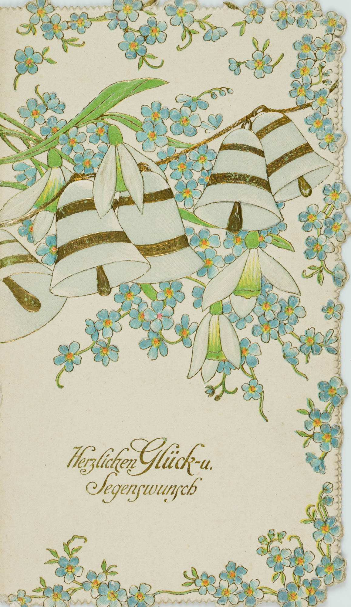 - Description: Beautiful greeting card with die-cut forget-me-nots and bells as well as gold lettering; inside handwritten greetings in ink.
