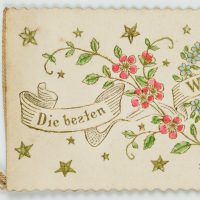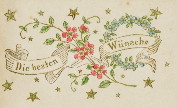 Unbekannt (20. Jahrhundert), Glückwünsche zur Hochzeit mit Blumen und Sternen. Prägedruck, um 1900, Glückwunschbillet
