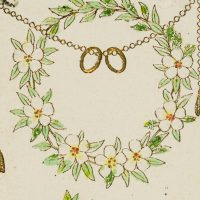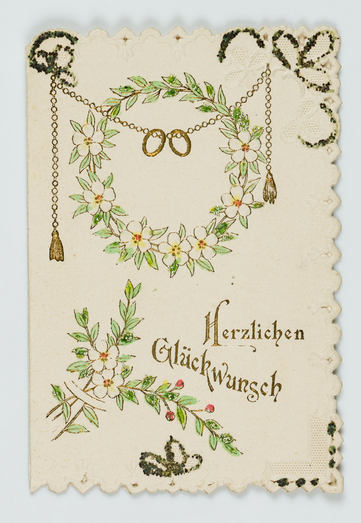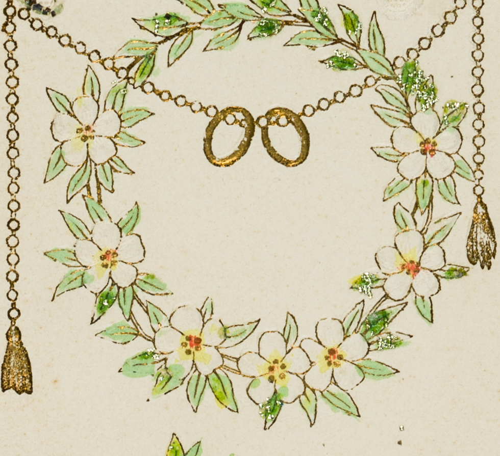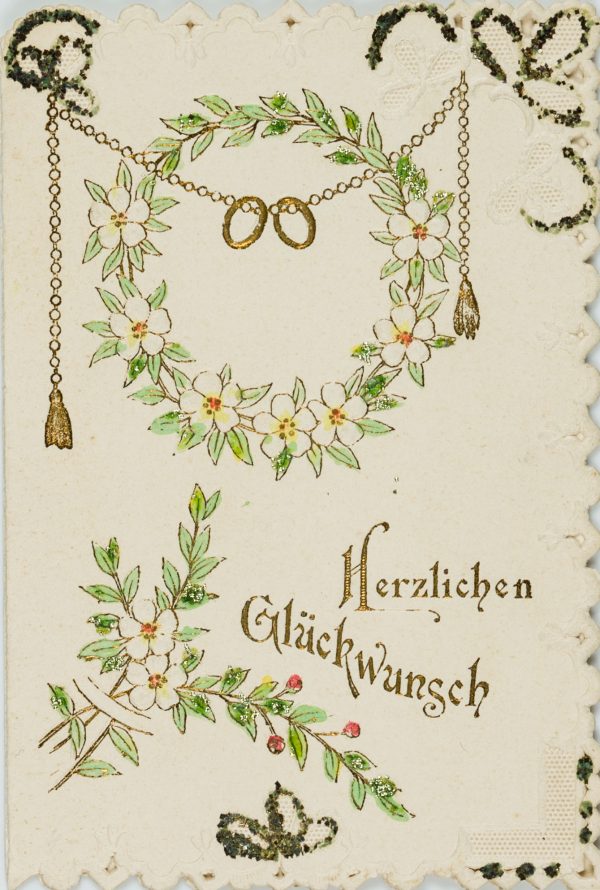 - Beschreibung: Kolorierter Prägedruck. Schöne Präge-Glückwunschkarte zur Verlobung; die floralen Elemente wurden festlich mit Glitter verziert, an einer goldenen edlen Kette sind zwei Ringe angebracht; innen mit gedruckten Glückwünschen.
