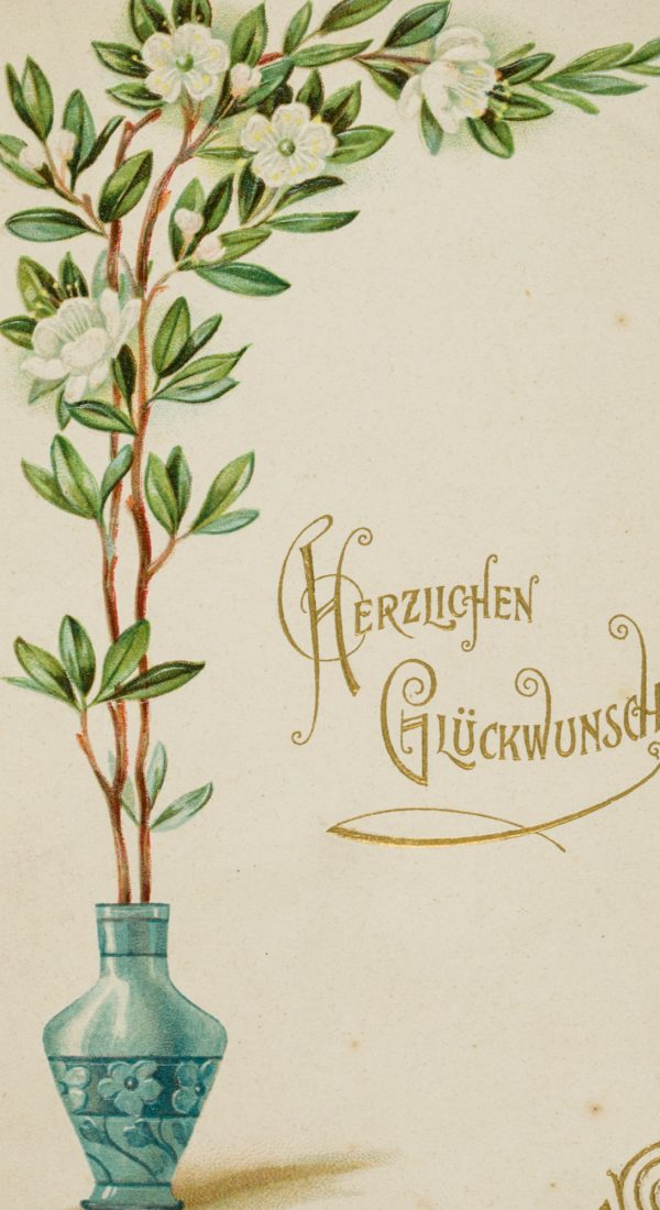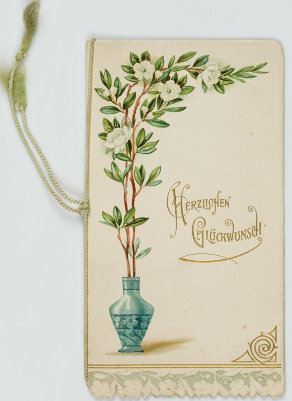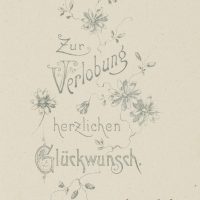 - Beschreibung: Verso datiert: “14.06.1908”. Schöne Präge-Glückwunschkarte zur Verlobung; eingehängter Doppelkarton mit gedruckten Glückwünschen sowie handschriftlich unterzeichnet mit Tinte.