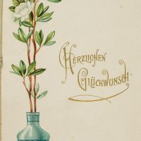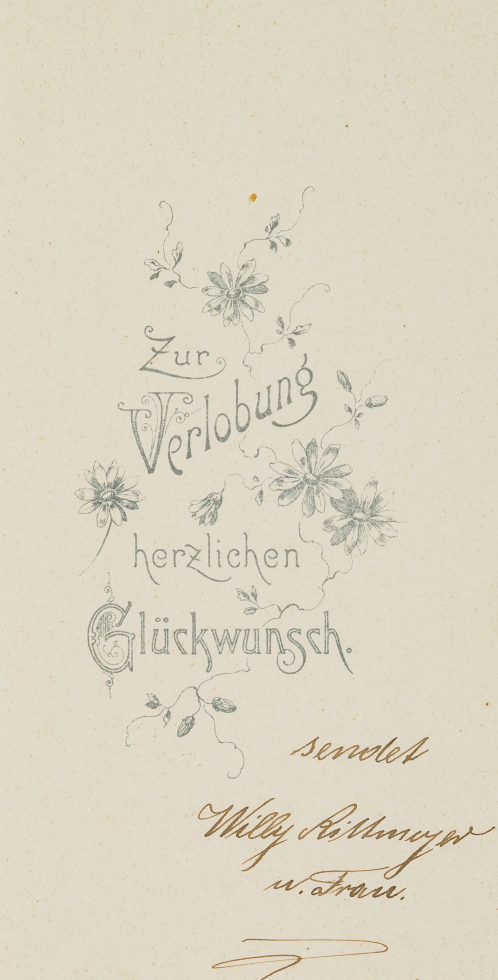 - Description: Dated on verso: “14.06.1908”. Beautiful embossed congratulation card for the engagement; inserted double cardboard with printed congratulations as well as handwritten signature in ink.