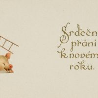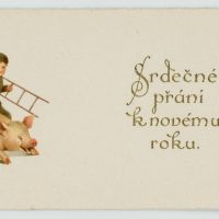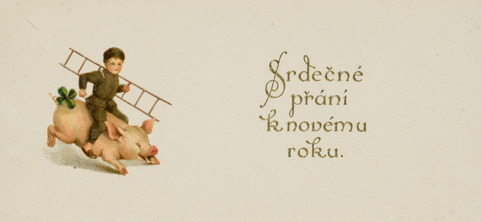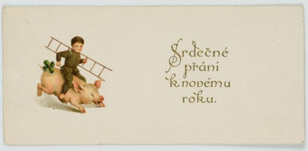 - Description: Polish greetings card for the New Year with piggy, chimney and lucky clover motif.