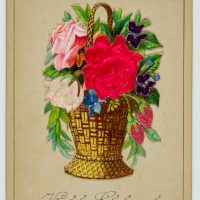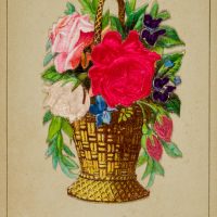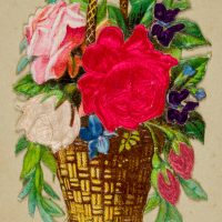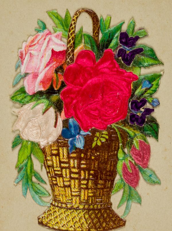 - Description: Very beautiful greeting card with silk appliqués; flower basket with pink roses and irises glued to the lower edge; by lifting the basket slightly, a printed verse can be discovered.