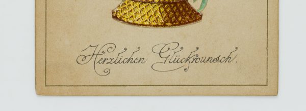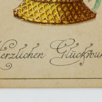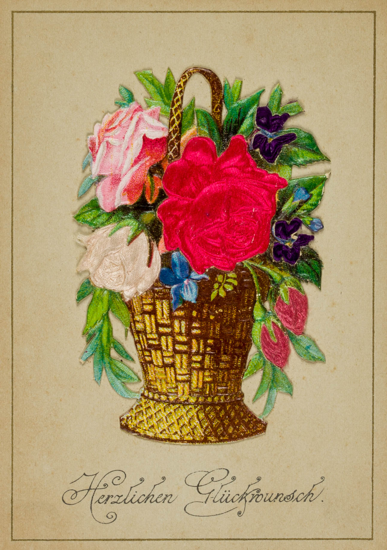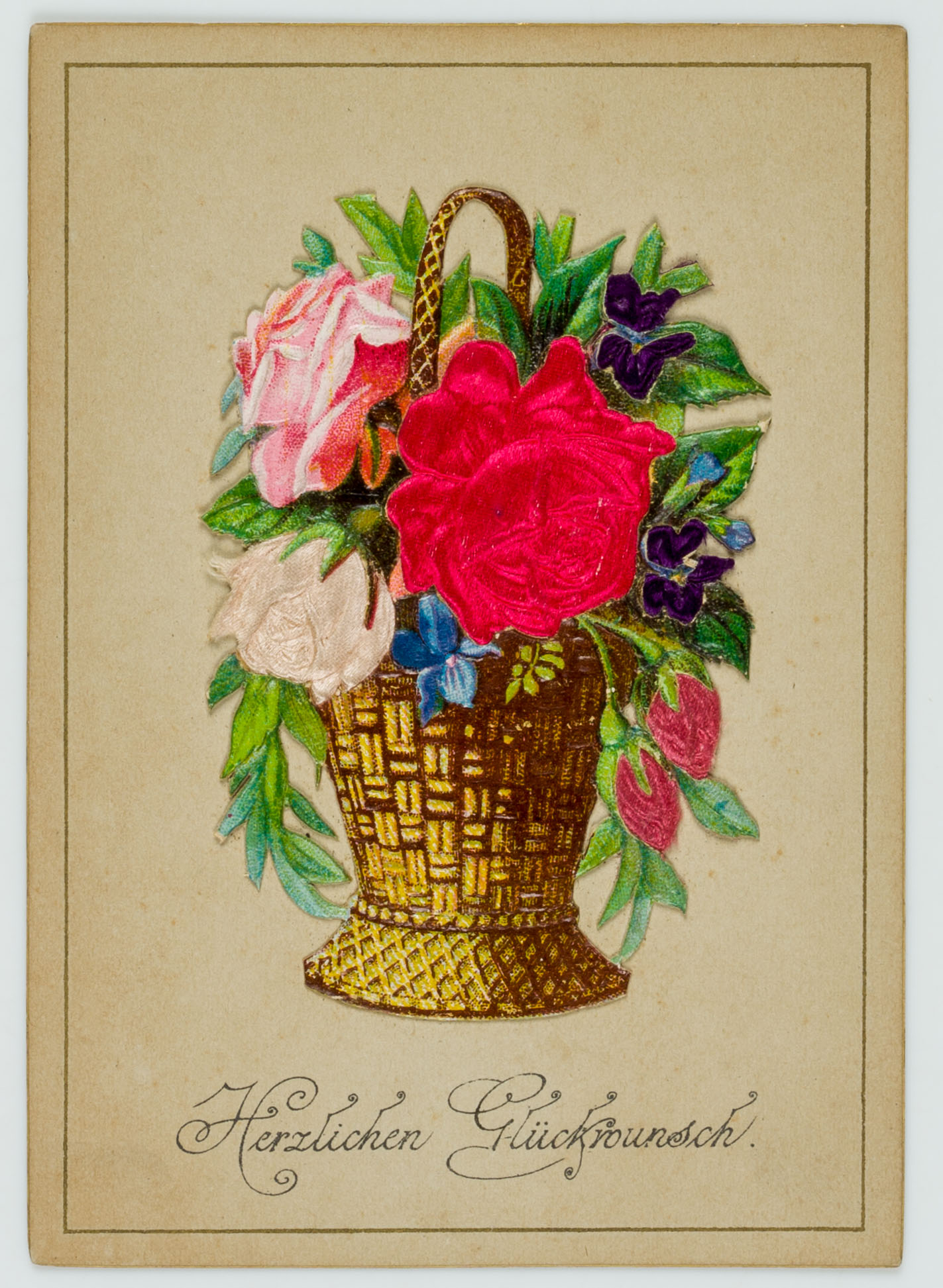 - Beschreibung: Sehr schöne Glückwunschkarte mit Seidenapplikationen; an der unteren Kante aufgeklebter Blumenkorb mit pinken Rosen und Iris; durch leichtes Anheben des Korbes ist ein gedruckter Vers zu entdecken.