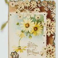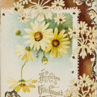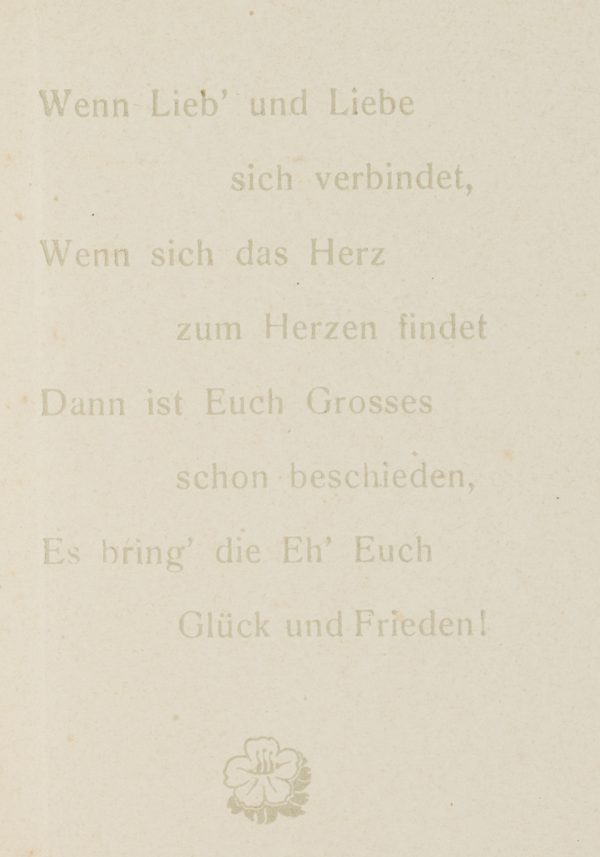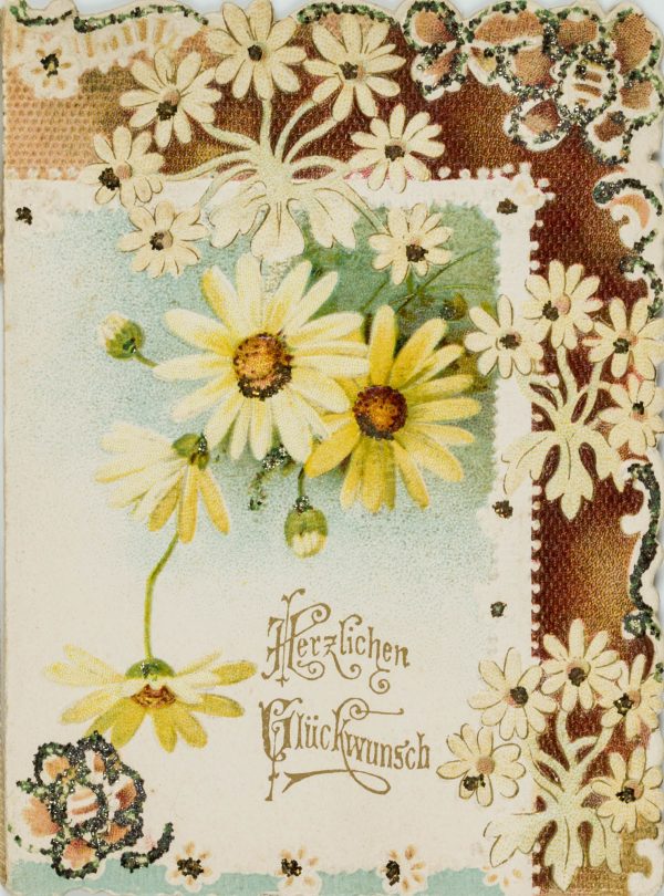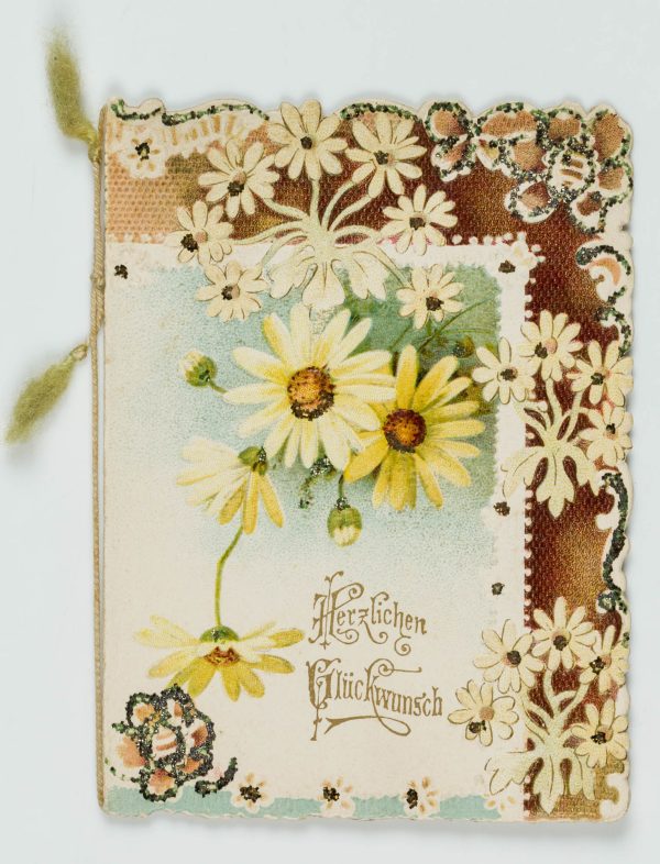 - Beschreibung: Farbig lithographische Faltkarte mit Prägung, mit Glitter und Goldschriftzug; eingehängtes Doppelblatt mit gedruckten Glückwünschen, sowie handschriftlich mit Tinte.