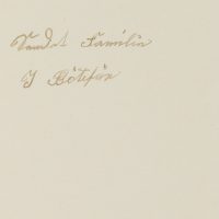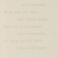 - Description: Colour lithographic folding card with embossing, with glitter and gold lettering; inserted double sheet with printed congratulations, as well as handwritten in ink.
