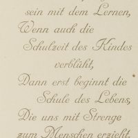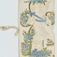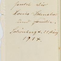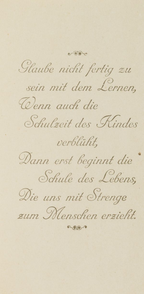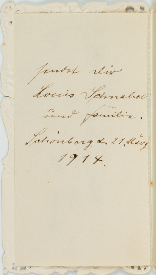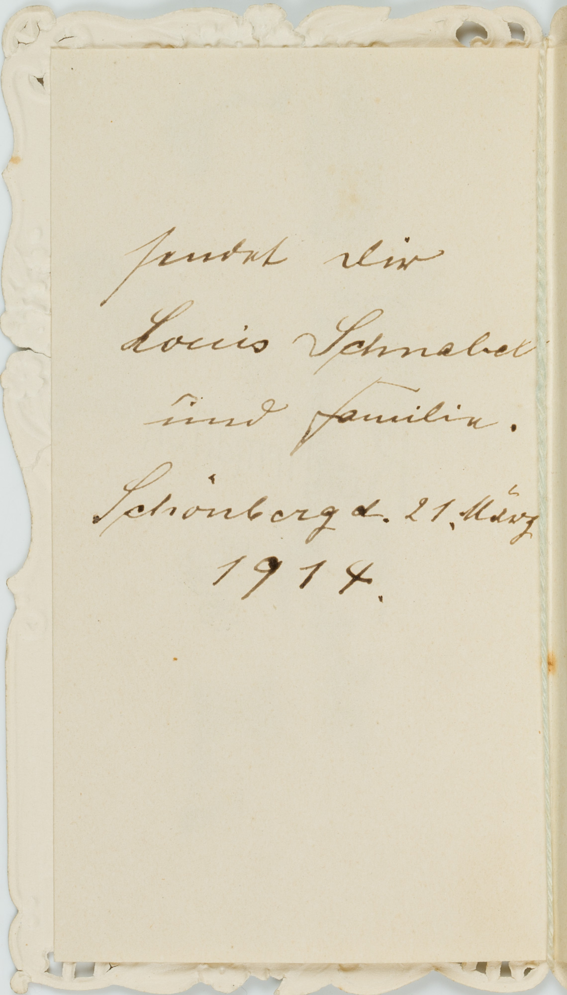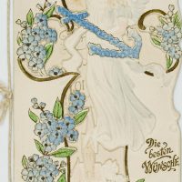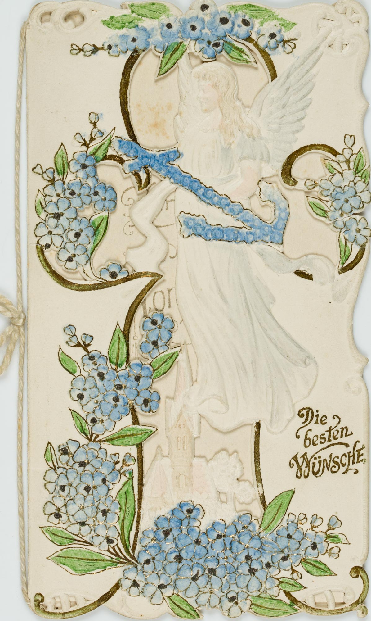 - Beschreibung: Auf der Innenseite handschriftlich in Tinte datiert und lokalisiert: “Schönberg d. 21. März 1914”. Bezaubernd schöne Glückwunsch-Karte zur Konfirmation mit Vergissmeinnicht-Motiv und Engel über einer Kirche; filigran gearbeitet mit Durchbrechungen; eingehängtes Doppelblatt mit gedrucktem Vers sowie handschriftlicher Dedikation.