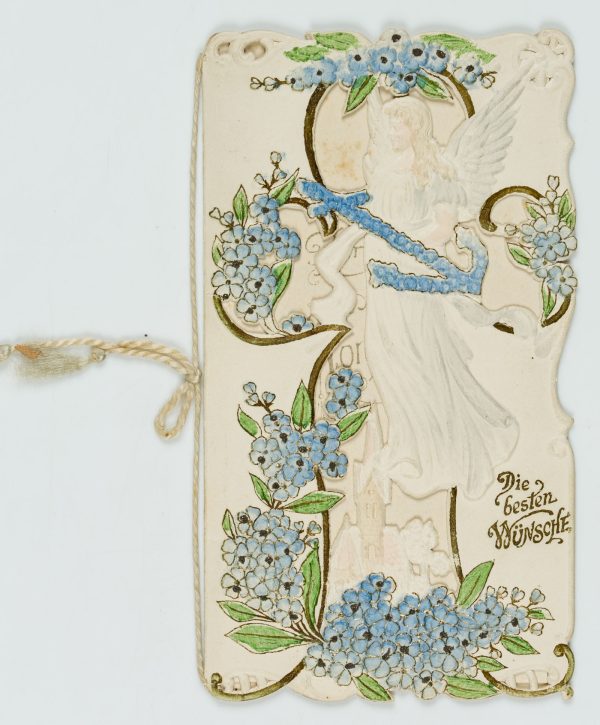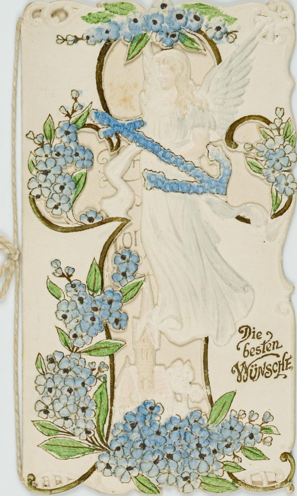 - Description: On the inside handwritten dated and located in ink: “Schönberg d. 21. March 1914”. Charmingly beautiful congratulation card for confirmation with forget-me-not motif and angel above a church; filigree work with openings; inserted double sheet with printed verse as well as handwritten dedication.