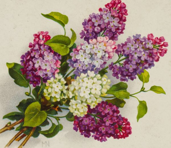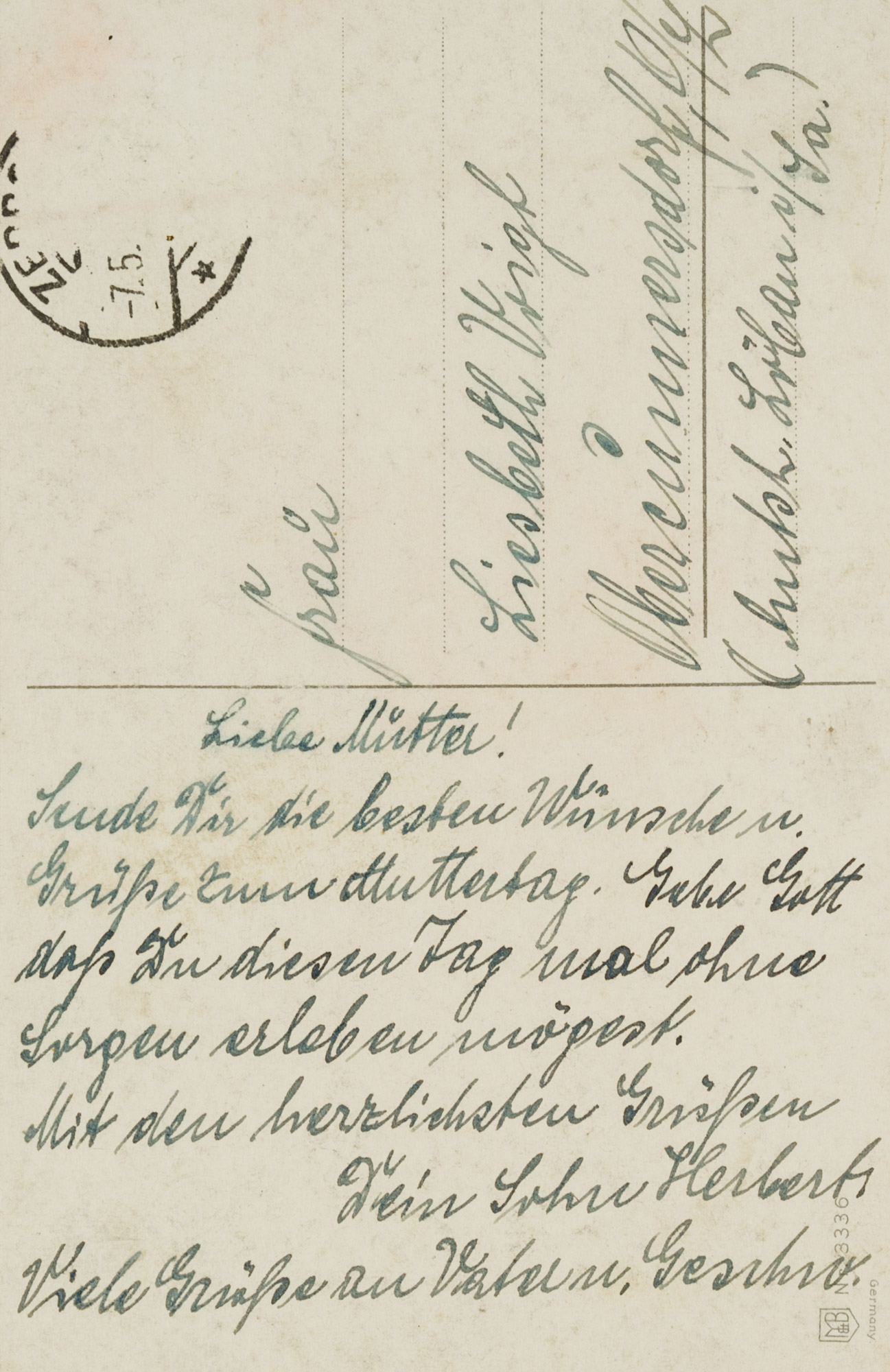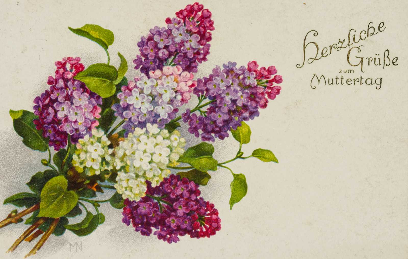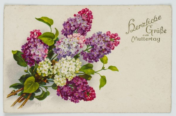 - Description: Very beautiful greeting card with lilac motif for Mother’s Day, artist’s monogram “MN”; on the verso handwritten in ink, addressed by a son to his mother.