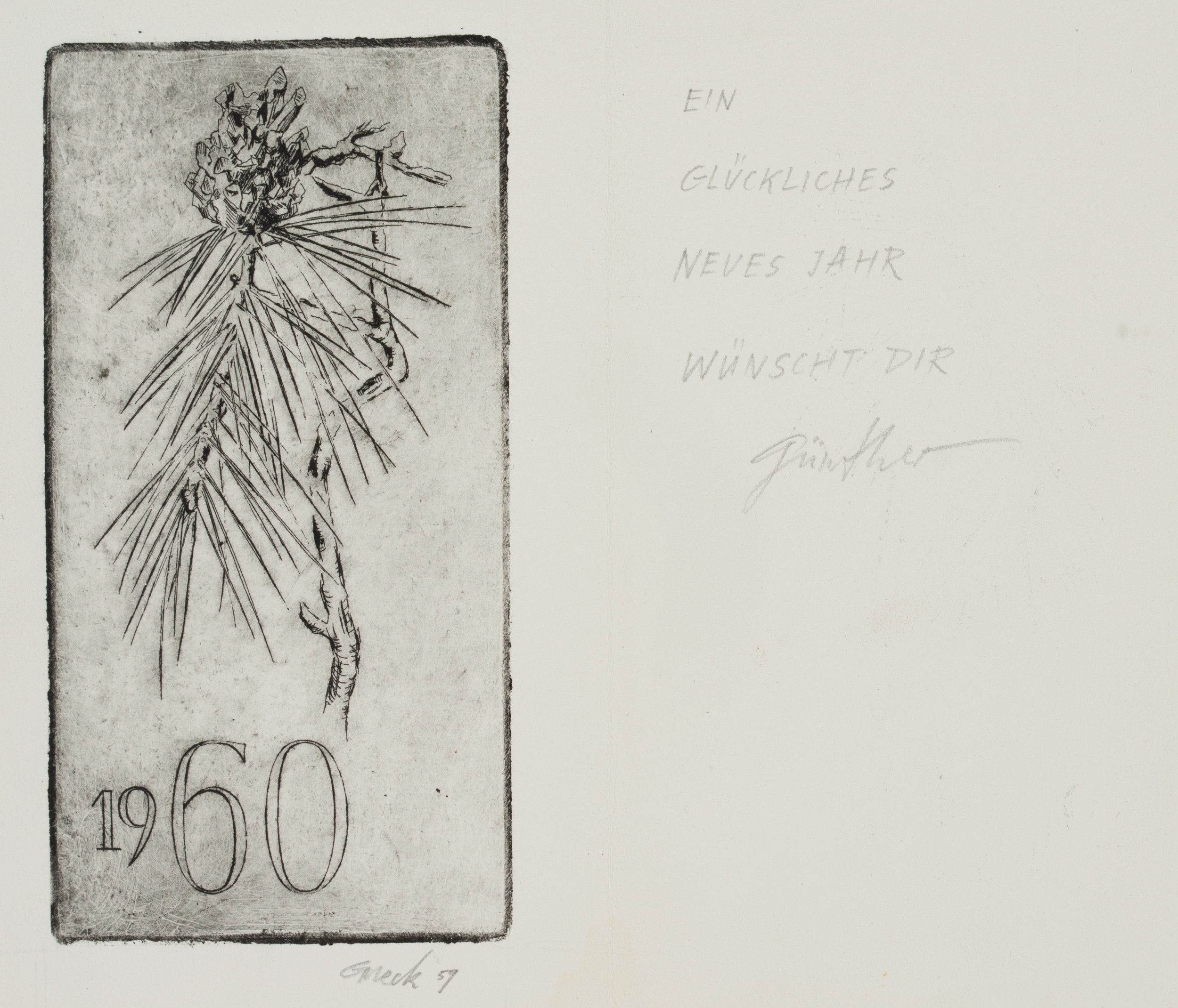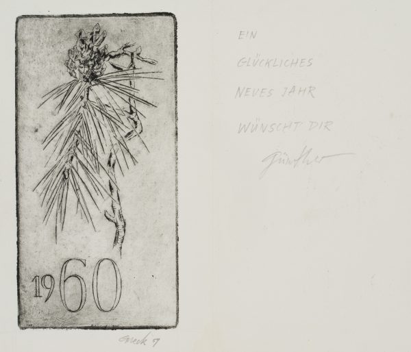 - Beschreibung: Handgeschriebene Grußkarte zum Neuen Jahr mit Original-Radierung des Künstlers.