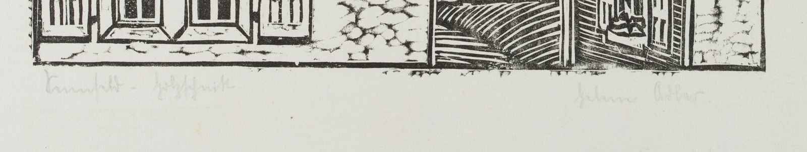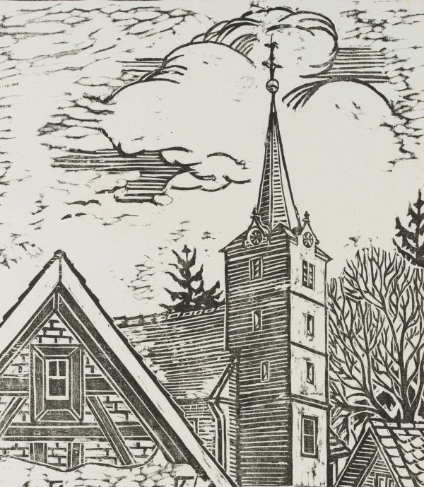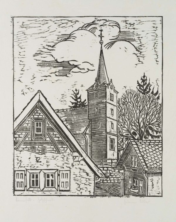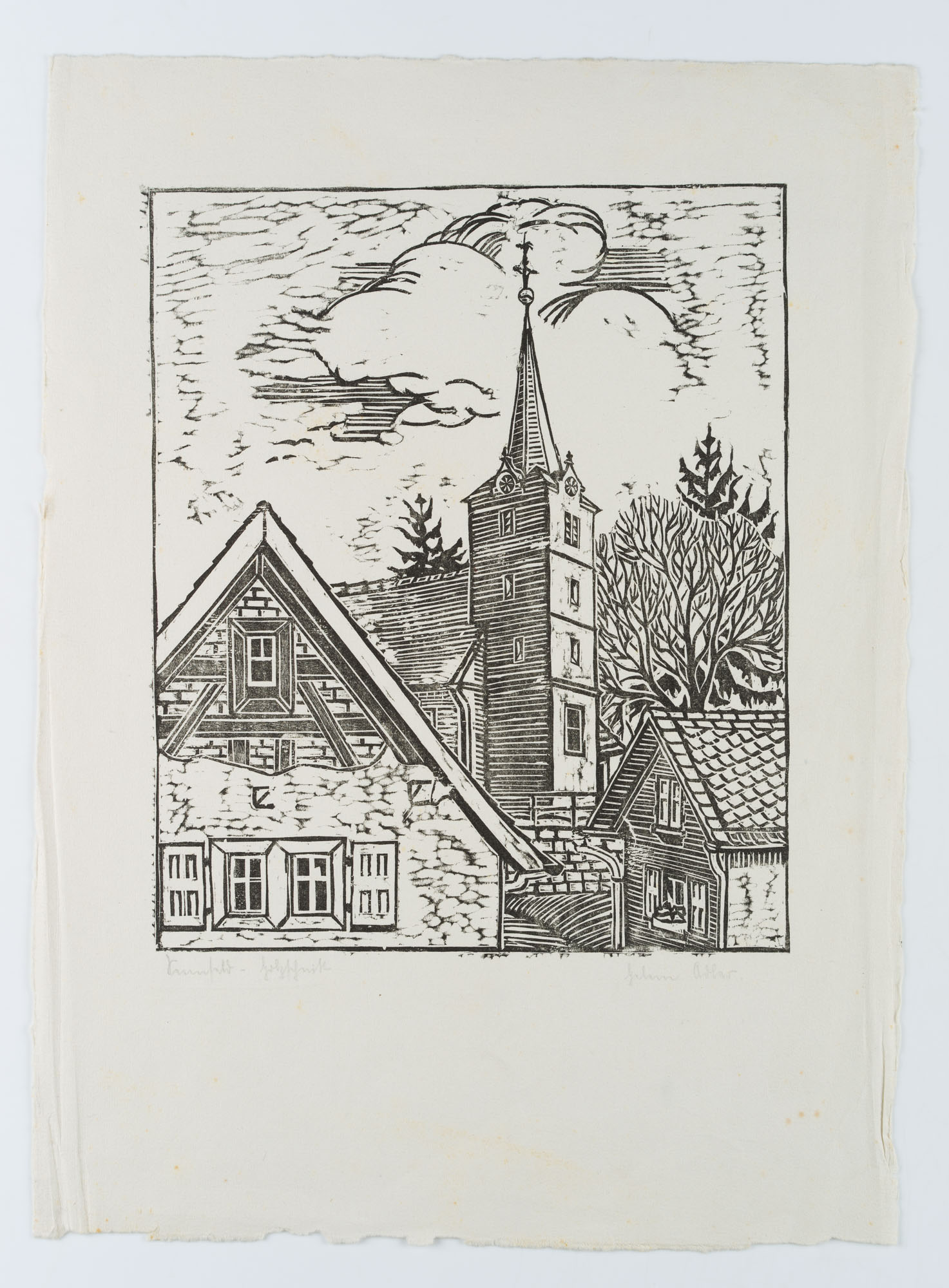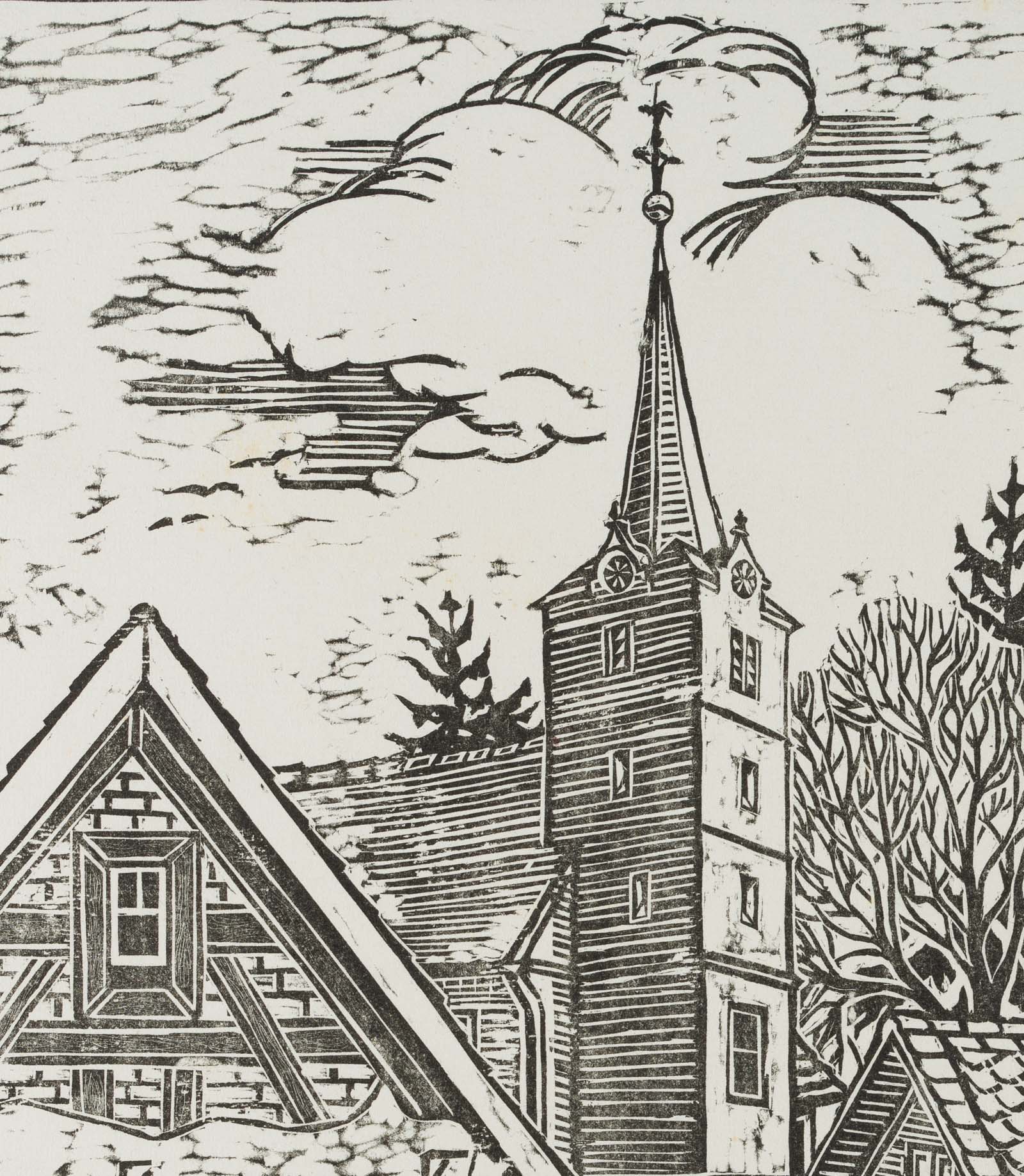 Unbekannt (20. Jahrhundert), Häuserfassaden mit Kirchturm, Badischer Odenwald, um 1900, Holzschnitt