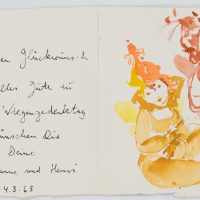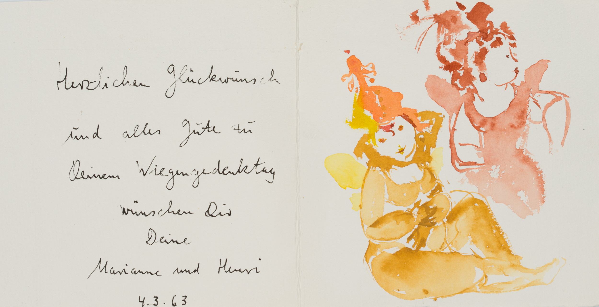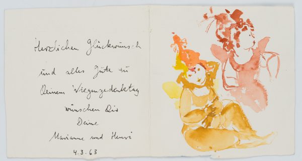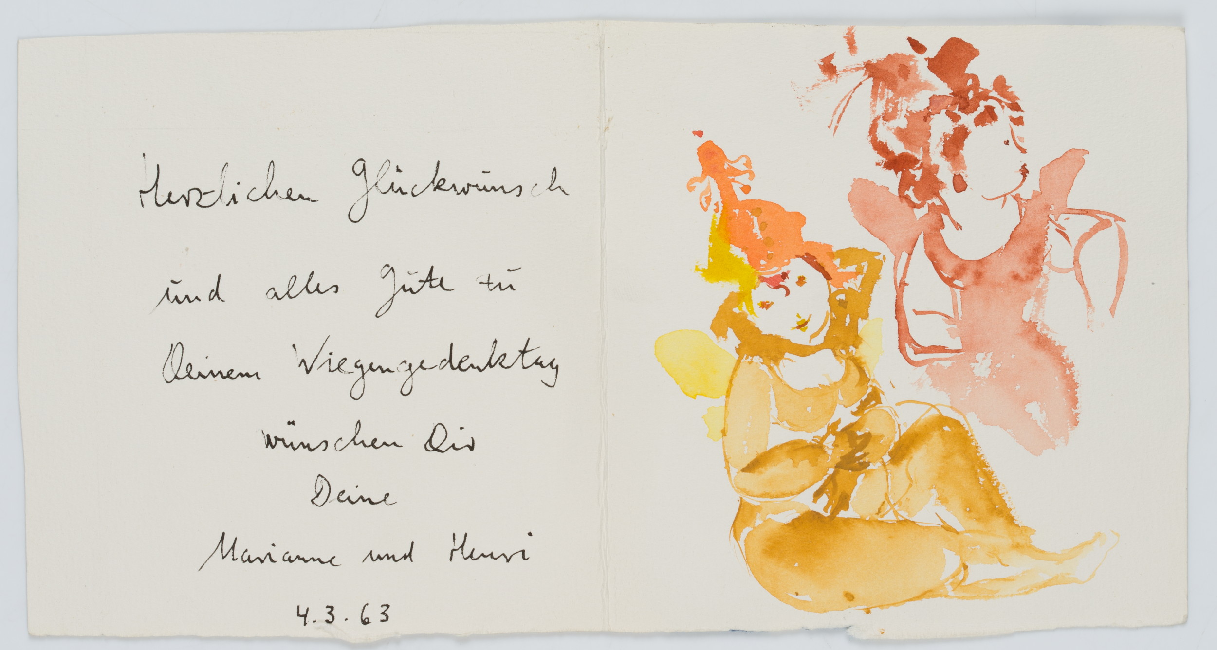 - Inscription: Inscribed by the artist’s hand: “Herzlichen Glückwunsch und alles Gute zu Deinem Wiegengedenktag wünschen Dir Deine Marianne und Henri”. Dated: “4.3.63”.