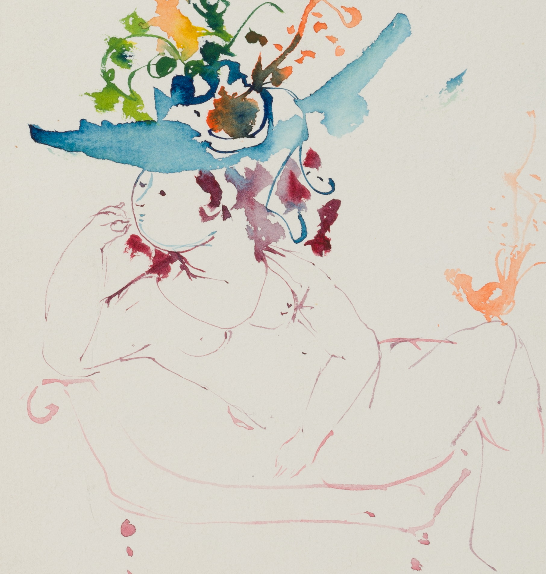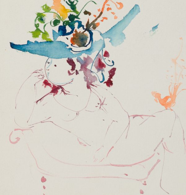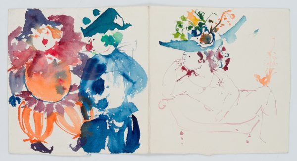 - Description: Female figures in extravagant clothing painted in bright colours as well as two harlequins.