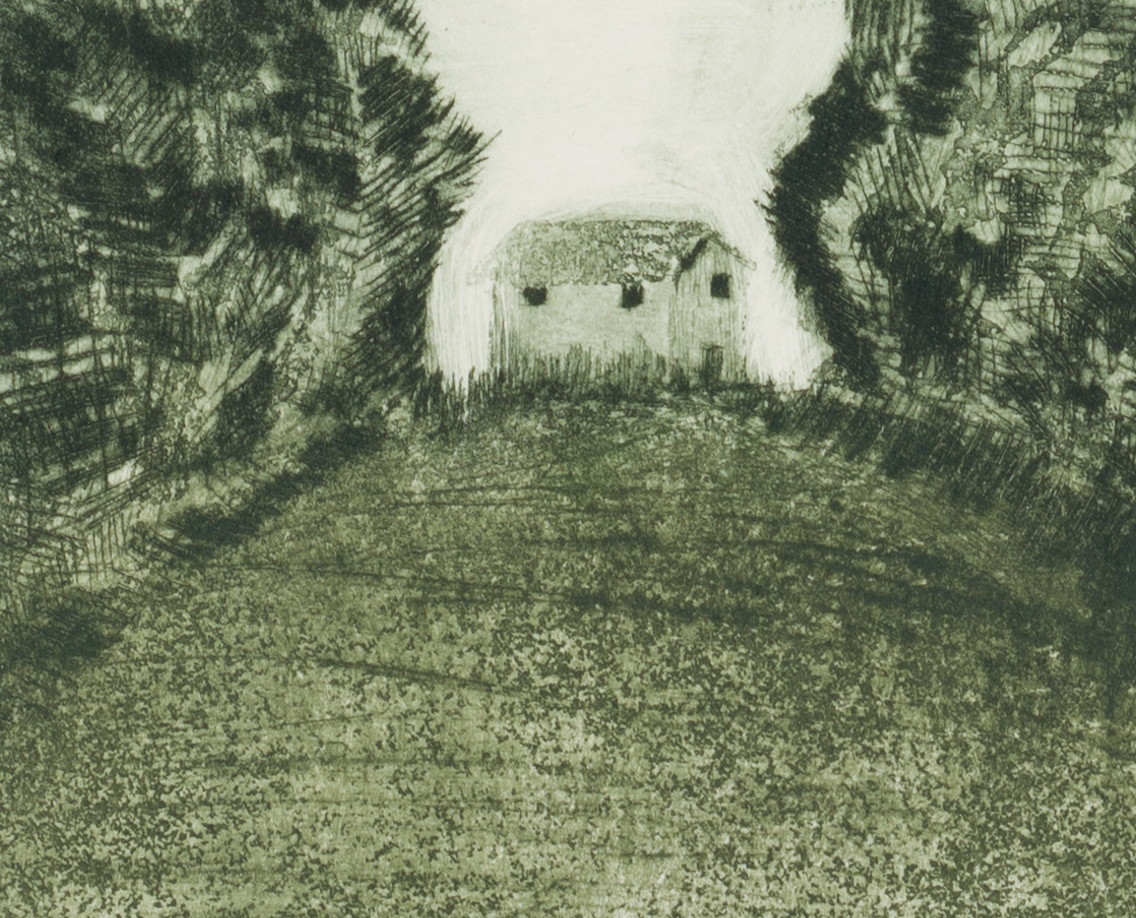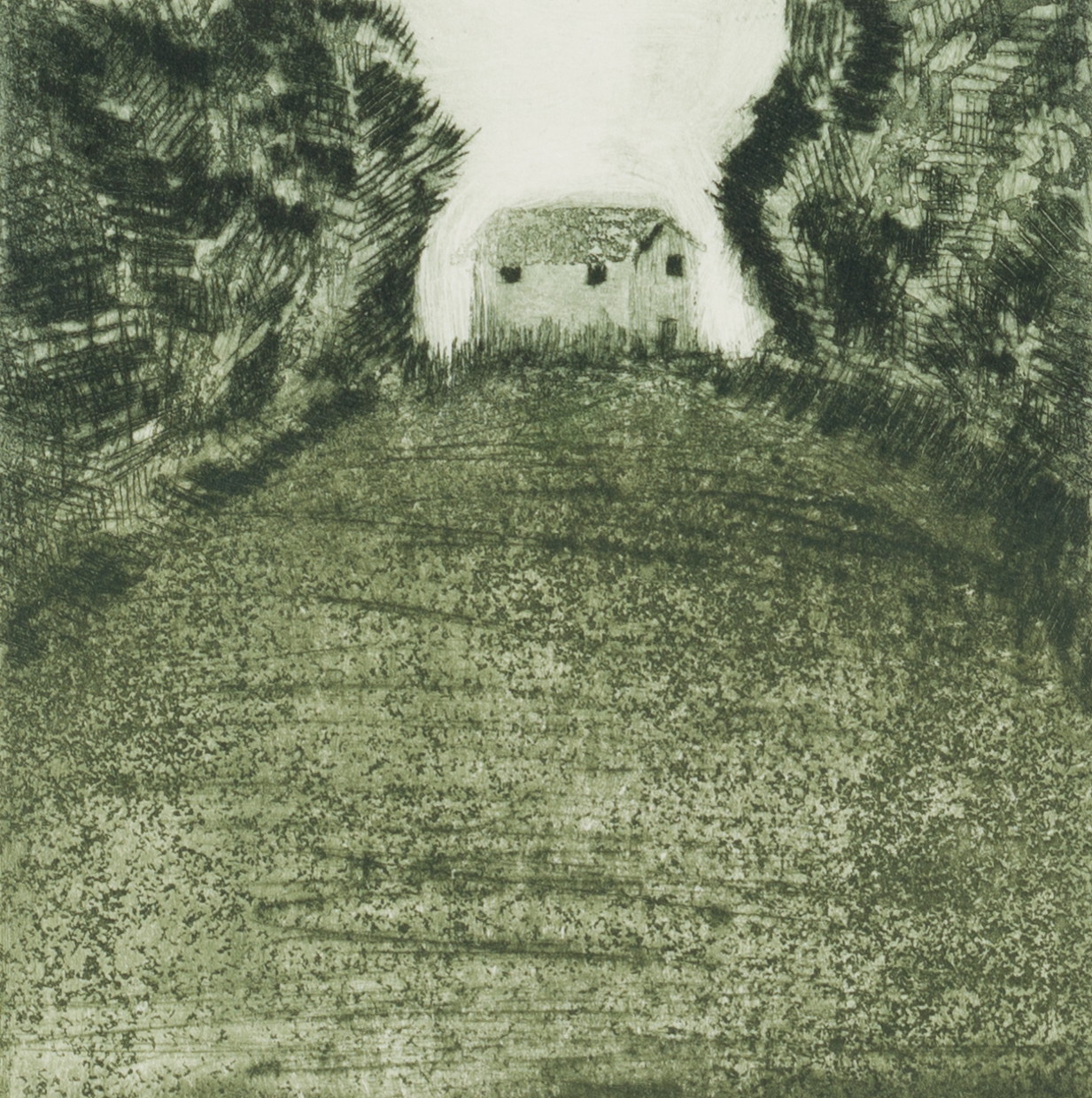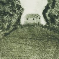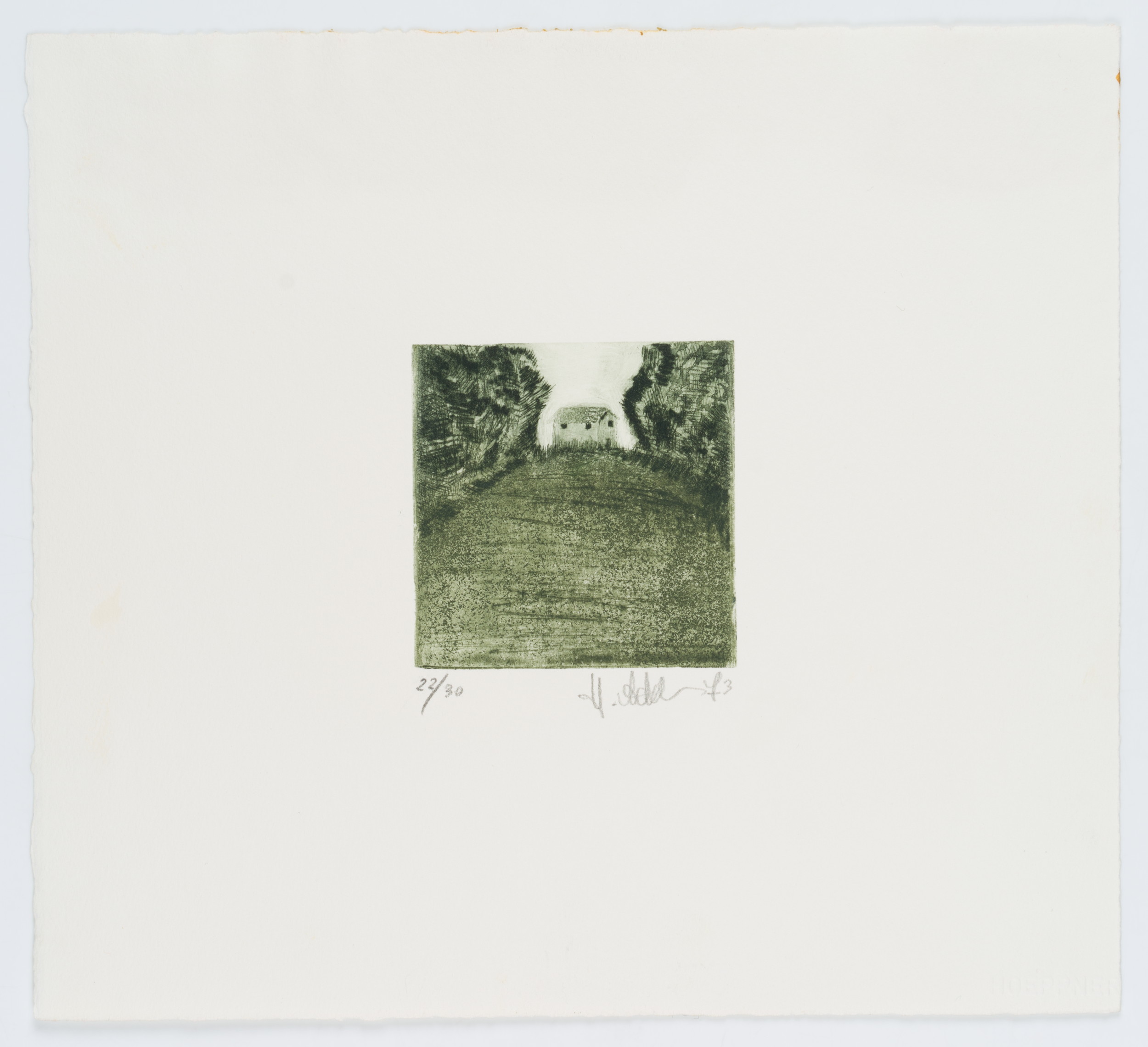 Unbekannt (20. Jahrhundert), Haus auf einem Hügel, 1973, Farbradierung