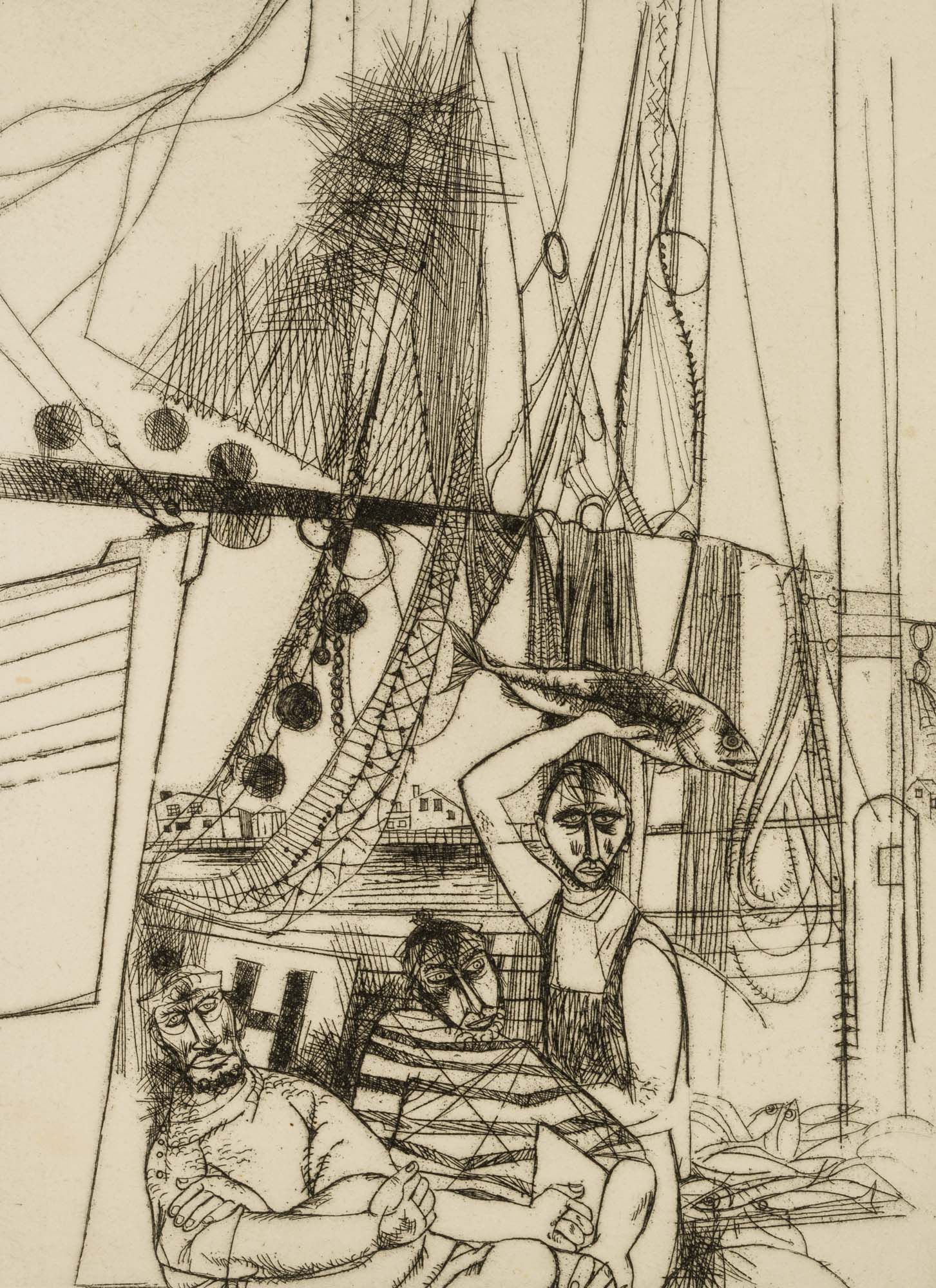 Unknown (20th century), Returning fishermen with abundant catch, , Drypoint etching