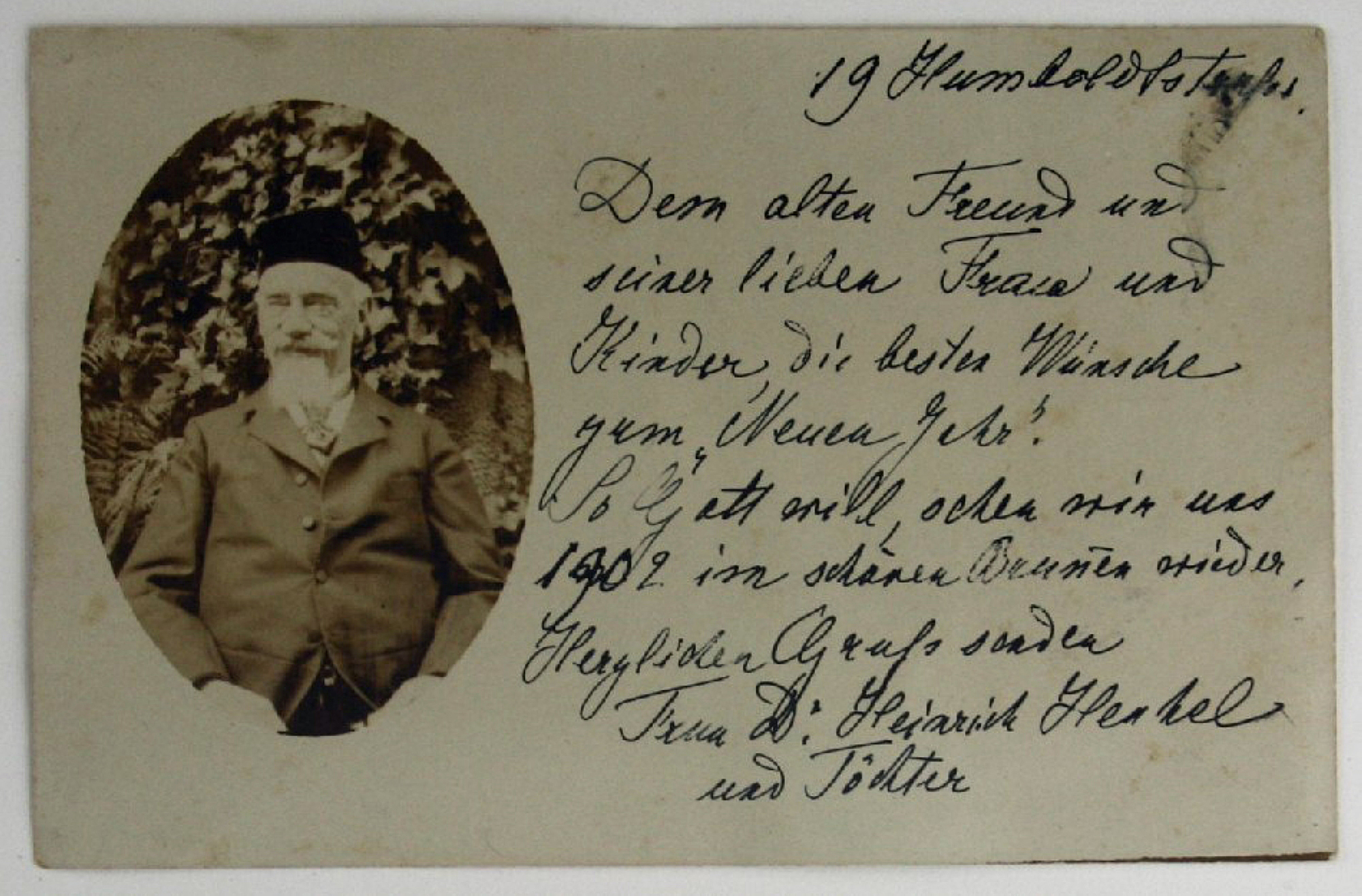 - Description: Unknown artist, photograph of an elderly gentleman on a postcard, 1901. Description: Photograph of Mr. Heinrich Henkel on a postcard from 1901. Next to it handwritten New Year’s greetings to a family friend.
