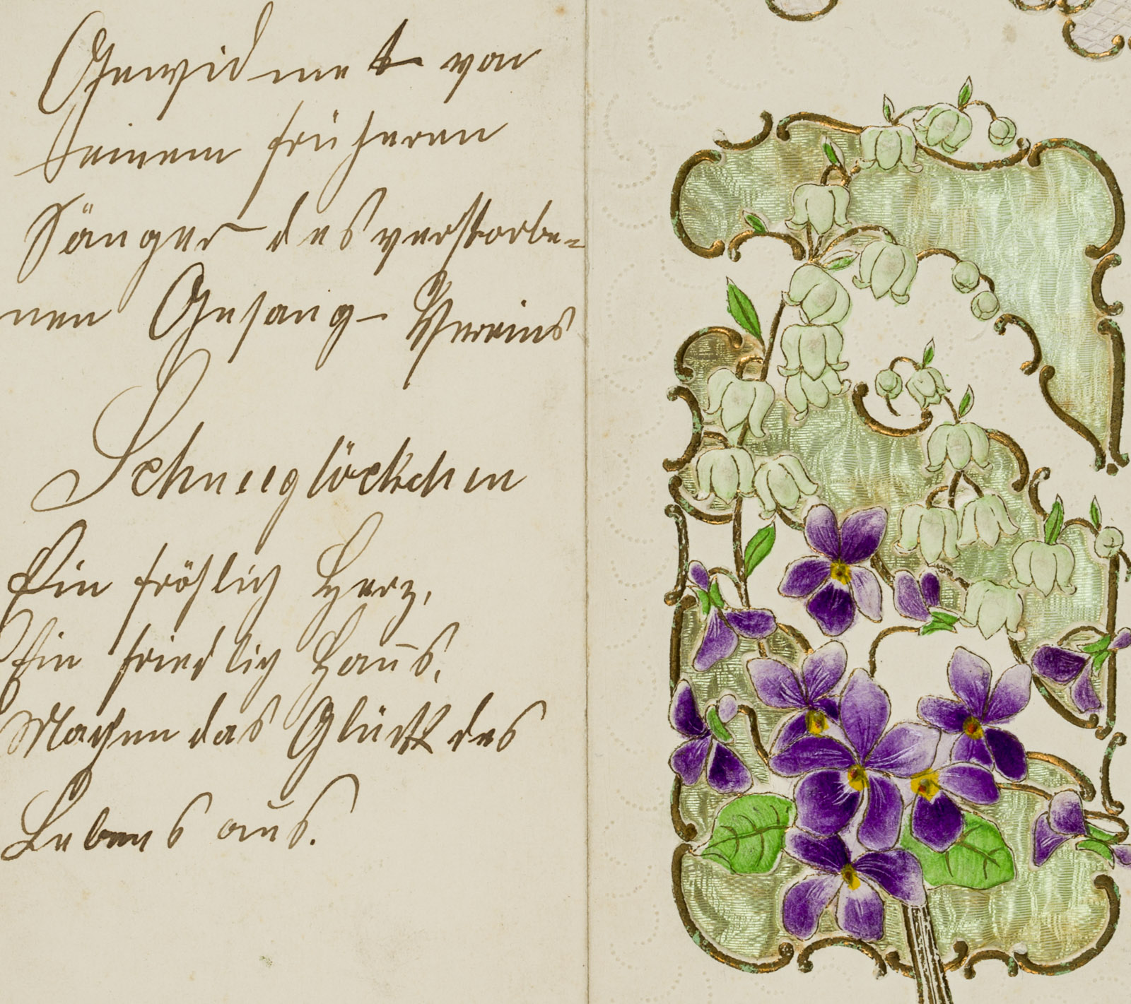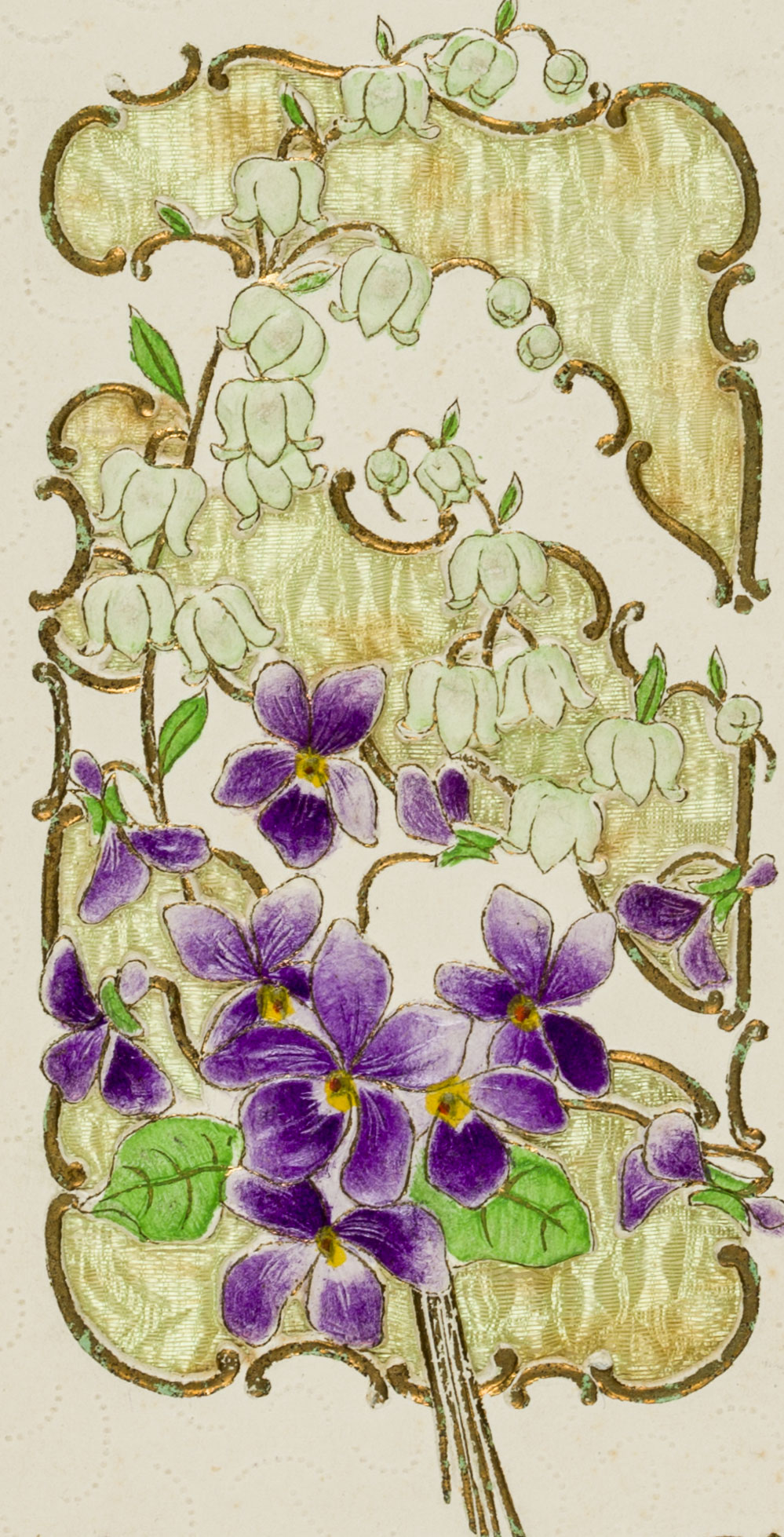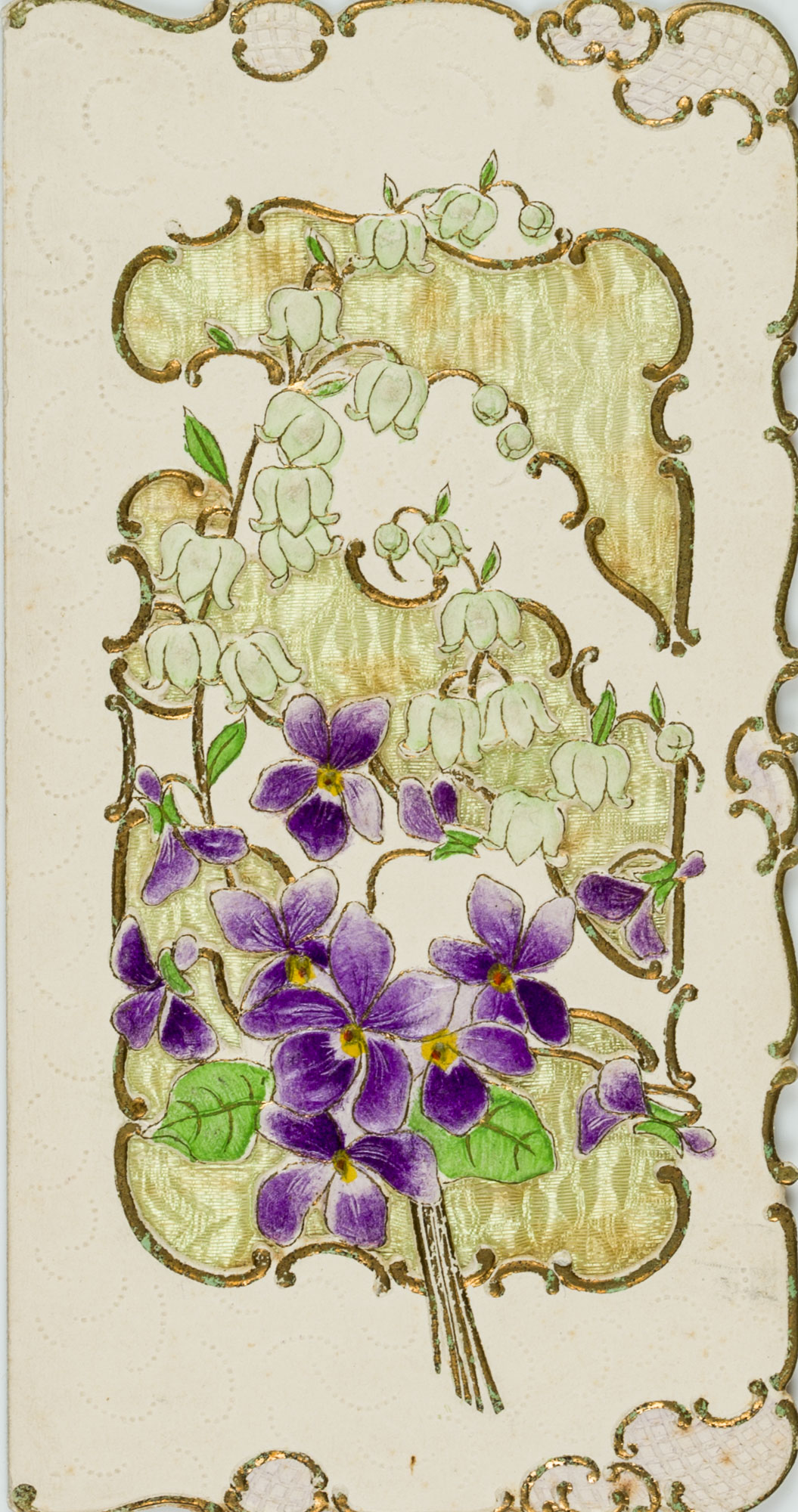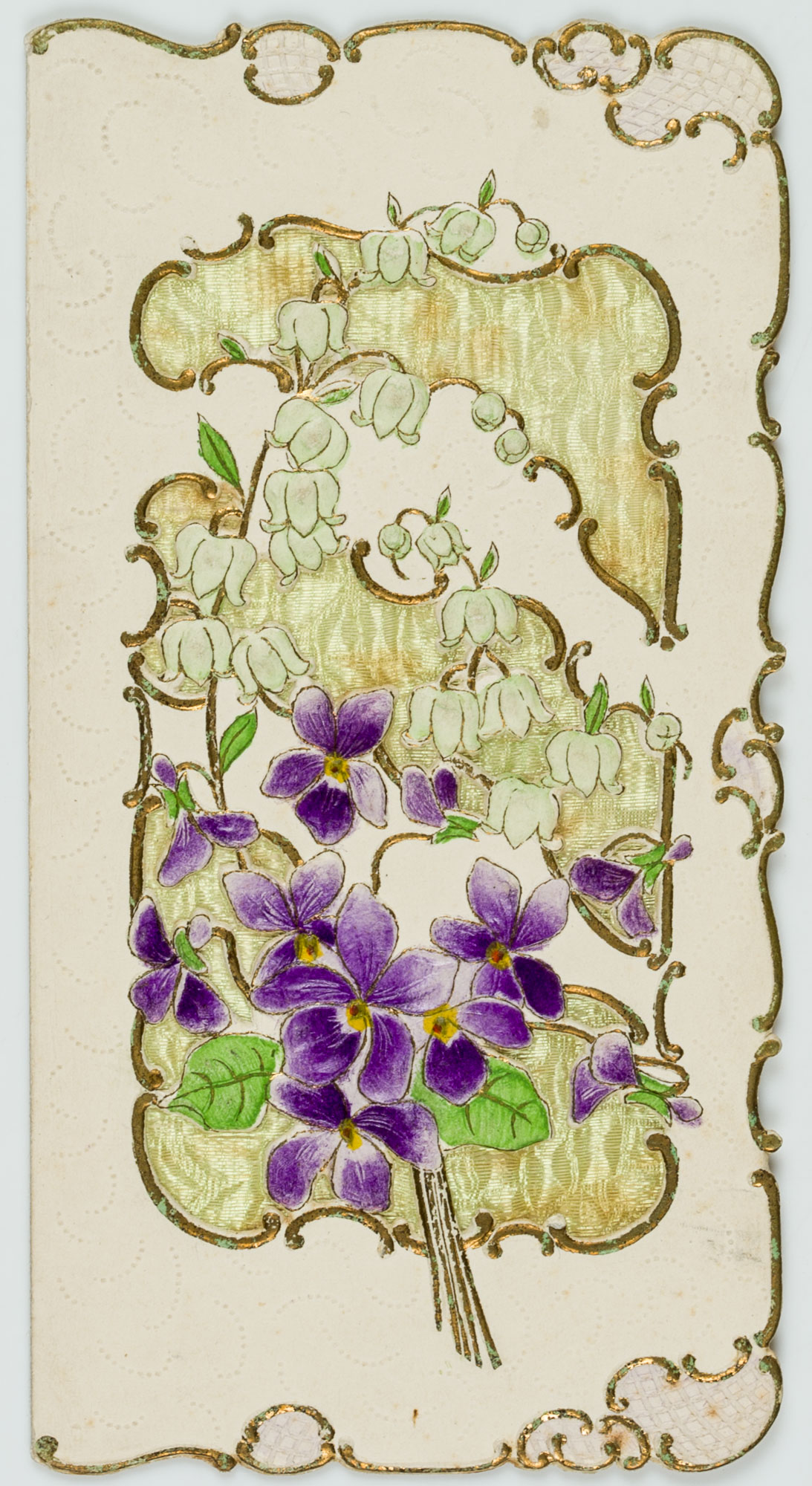 - Description: Beautiful embossed greeting card in Art Nouveau style, backed with fabric and gold ornaments; handwritten inscription in ink on verso.