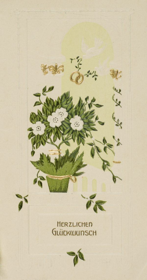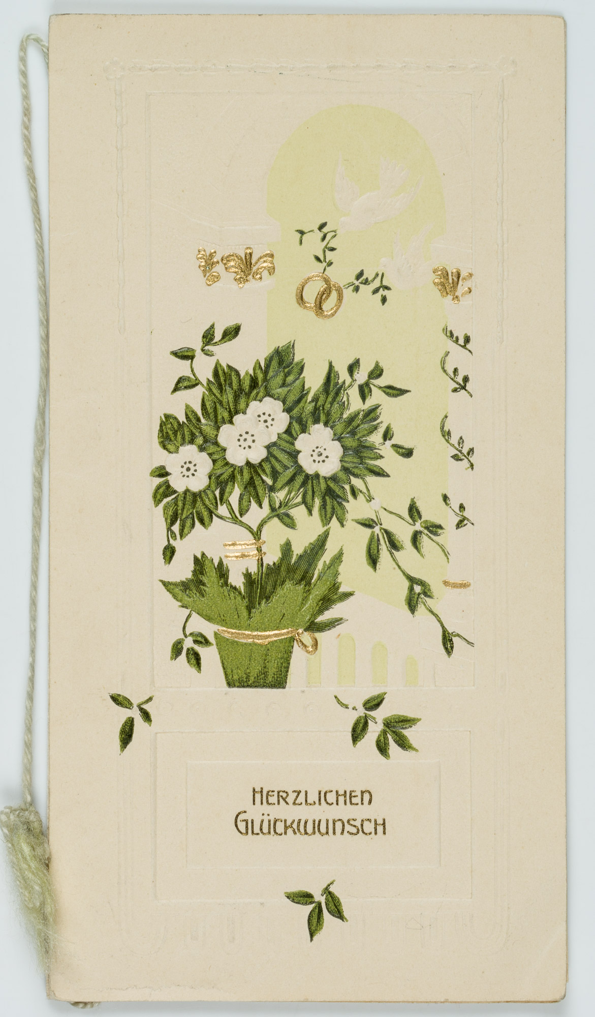 - Bezeichnung: Oben sind zwei Tauben mit Zweigen dargestellt; eingehängtes Doppelblatt mit gedruckten Glückwünschen.