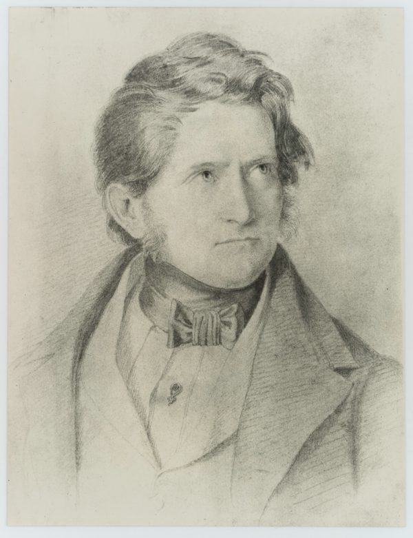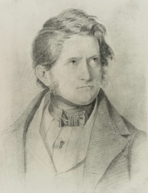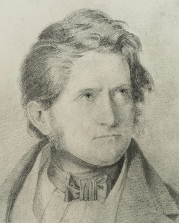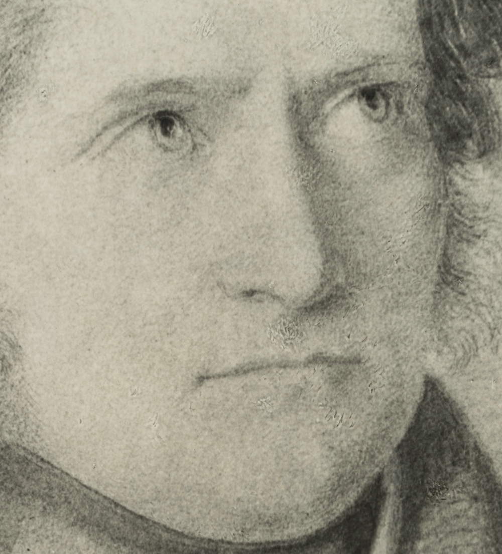 - Beschreibung: Reproduktion einer Zeichnung auf Papier. Brustbild im Halbprofil eines jungen Mannes mit entschlossenem Blick.
