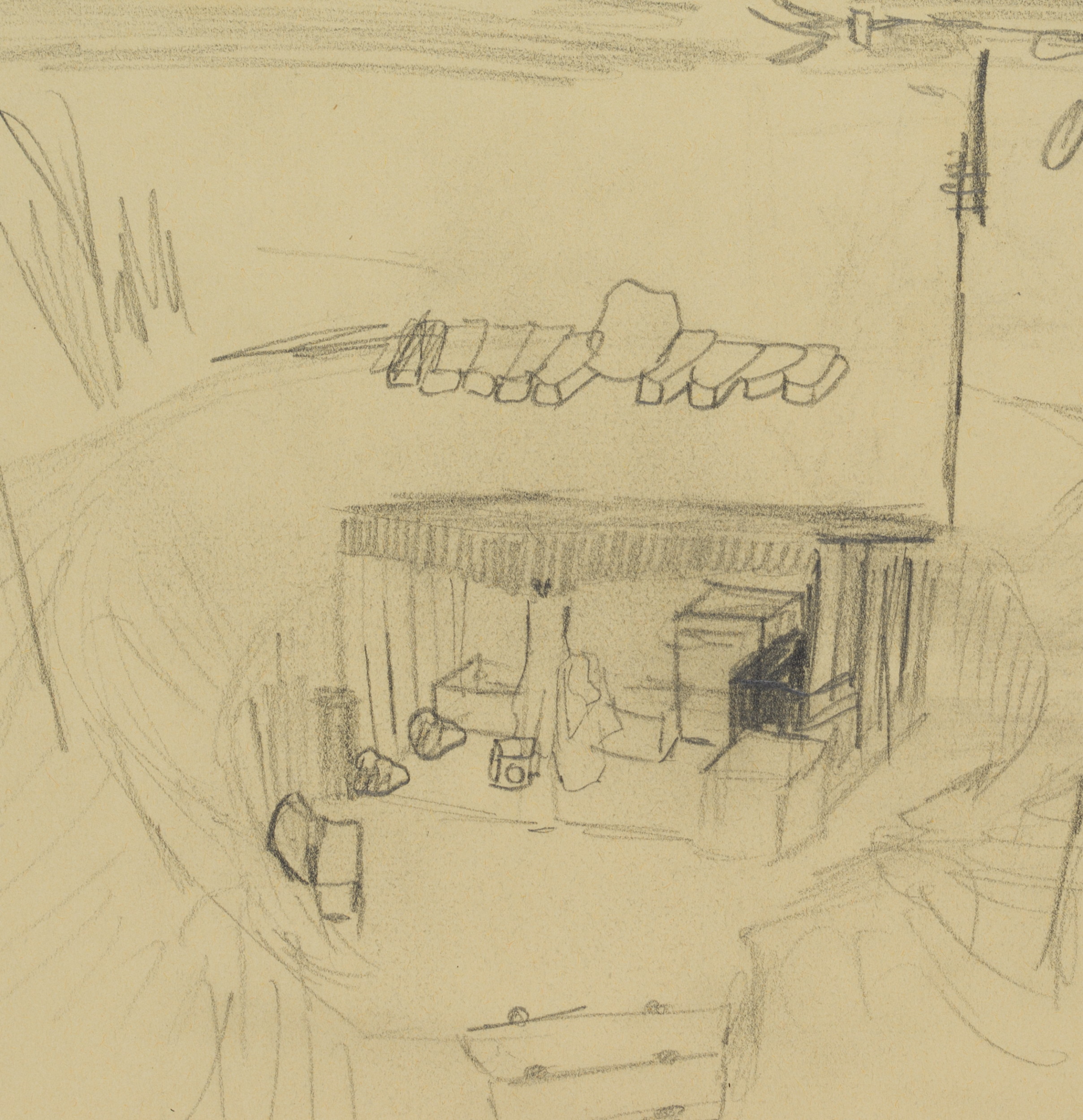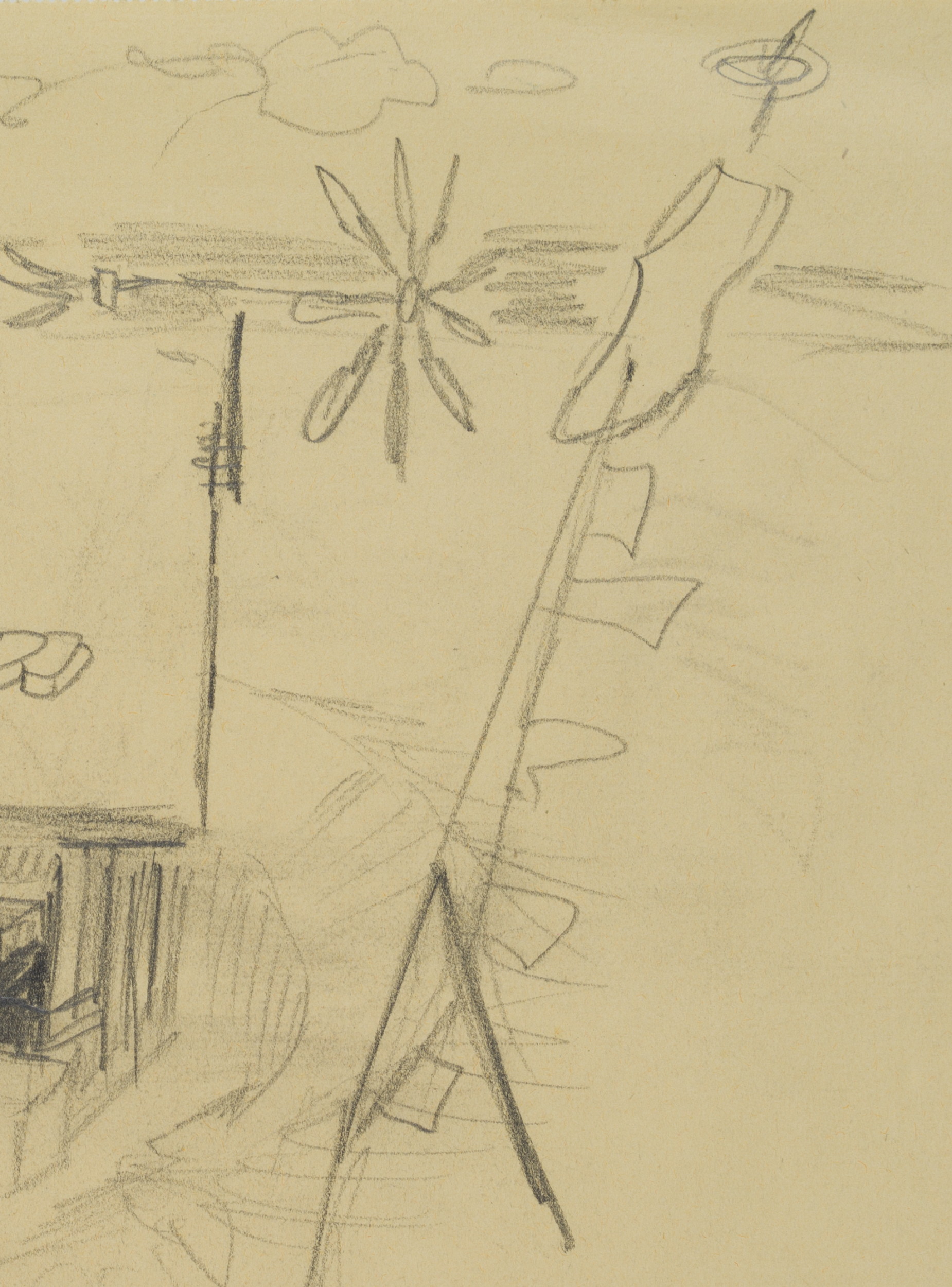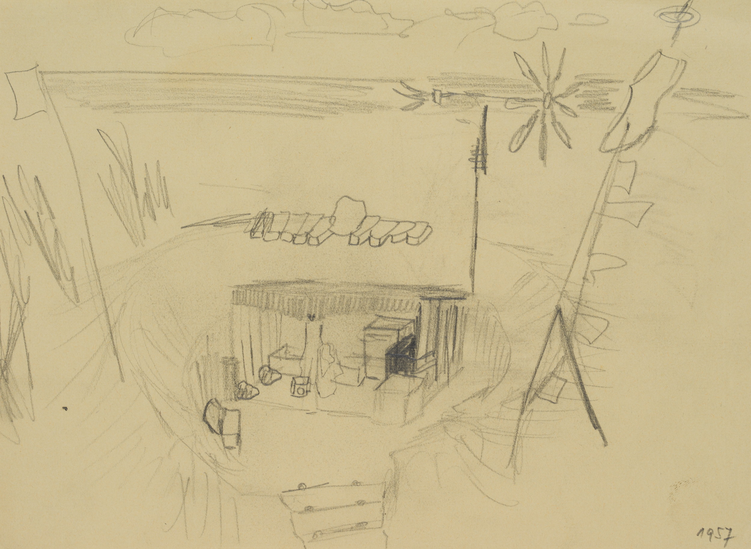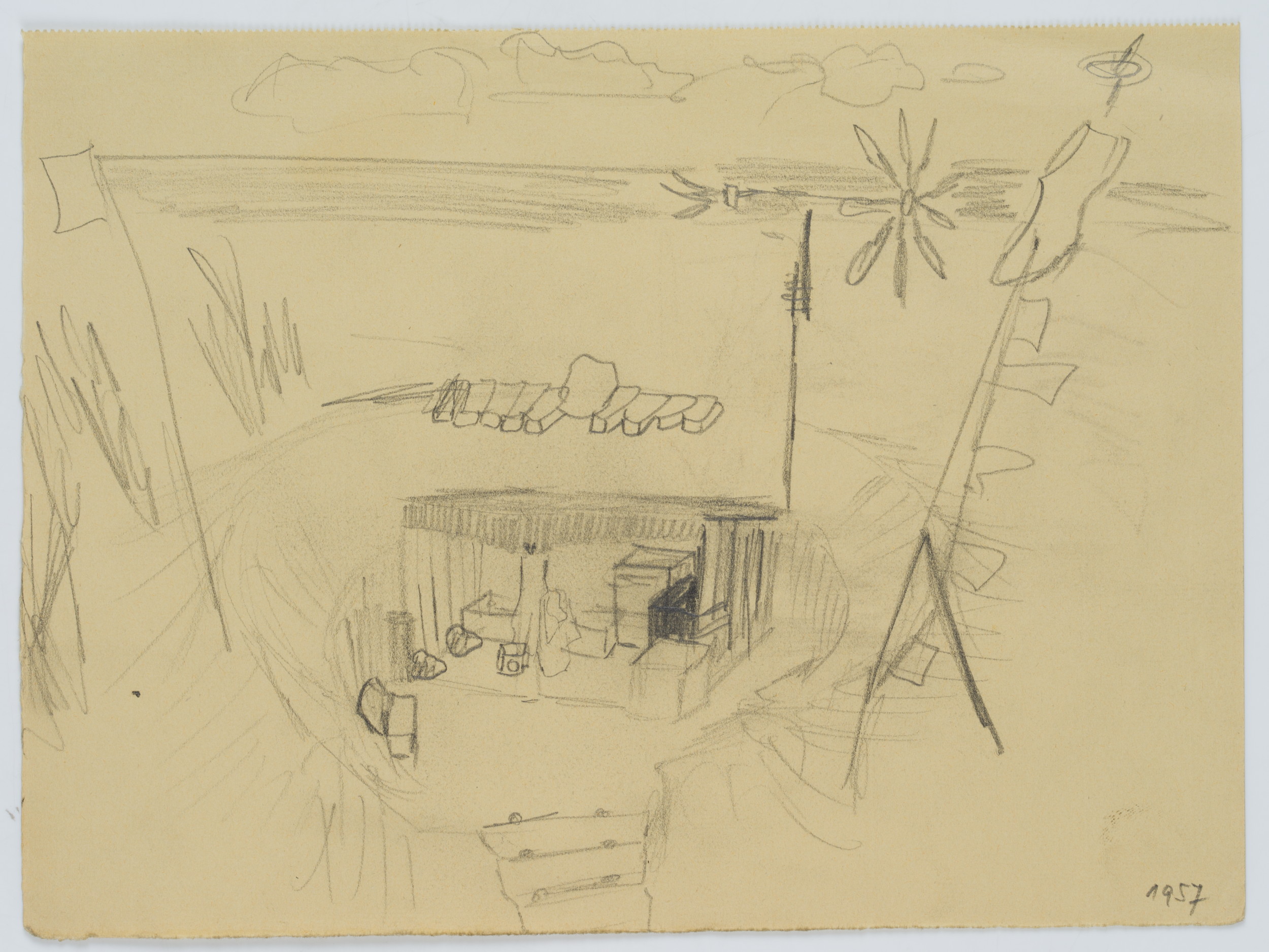 Unknown (20th century), Caricature of an inhabited sandcastle, 1957, Pencil