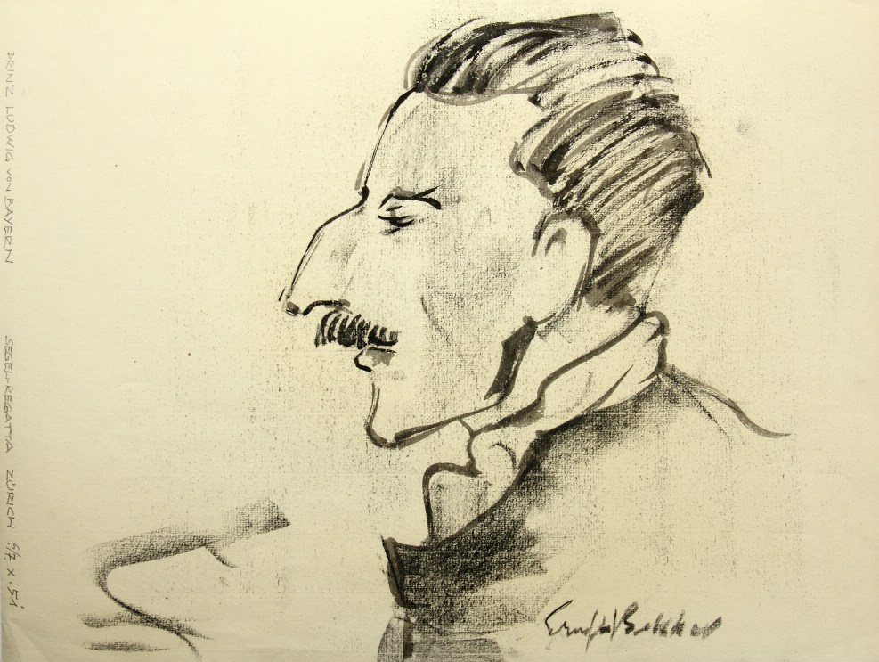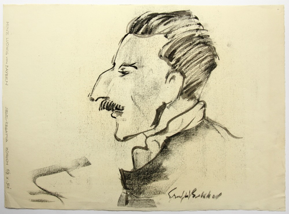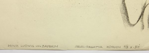 - Inscription: Signed by the artist “[?] Bekker” below the image. At the edge of the sheet are inscriptions in pencil: “Prince Ludwig of Bavaria”, made at the “Sailing Regatta Zurich 6./7.x[19]51”.